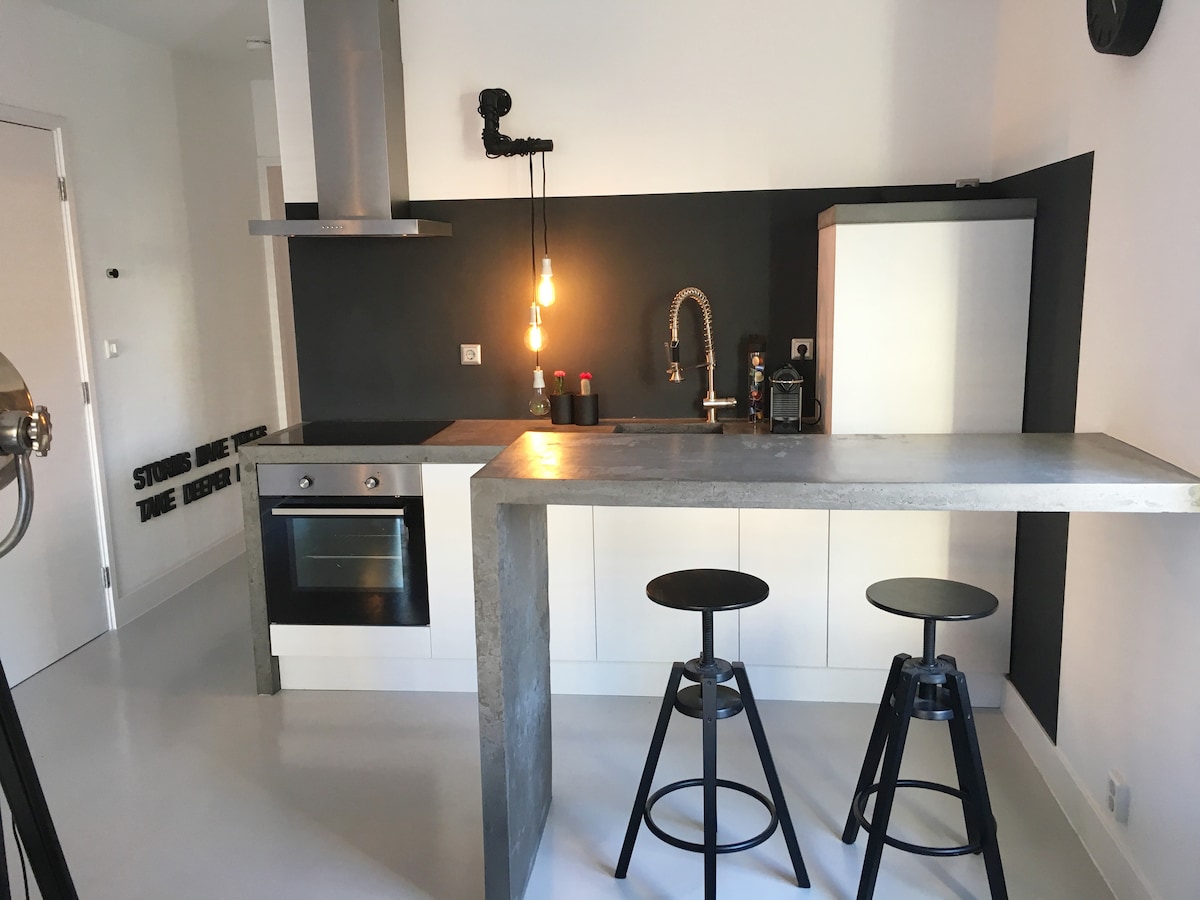 Árasán tionsclaíoch cosy, éadrom, amh, nua - aimseartha. Is cloch é le caitheamh amach ón gCáca bríomhar agus tabharfaidh fuinneog an bhá radharc iontach duit i dtreo na gcanálacha meánaoiseacha agus an fhoirgnimh ‘Waag ', séadchomhartha stairiúil náisiúnta atá suite ar Waagplein. An áit a bhfaighidh tú na beáir agus na bialanna áitiúla is fearr freisin. Tá sé gar do roinnt búitíceanna, bialanna agus caiféanna atá le fáil sa gharchomharsanacht.
