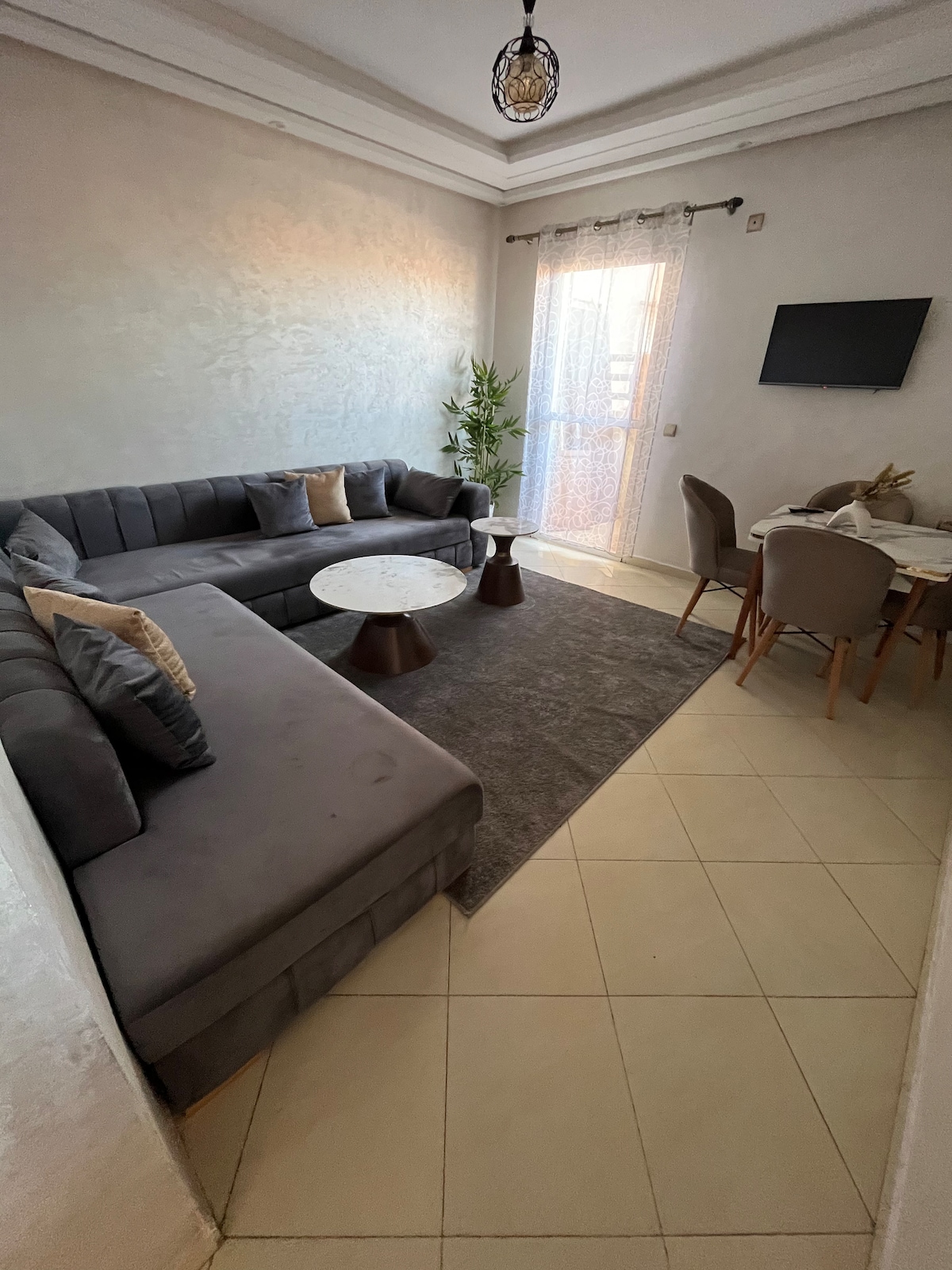 Is é an t - árasán seo in Marrakech an áit is fearr le haghaidh fanacht taitneamhach. Cuimsíonn sé cistin fheistithe, dhá sheomra leapa: ceann amháin le leaba dhúbailte agus balcóin, agus an ceann eile le dhá leaba ar leith. Tá seomra suí traidisiúnta Maracach sa seomra suí geal nua - aimseartha, atá foirfe chun do scíth a ligean. Cuireann an seomra folctha na compord go léir a theastaíonn uait ar fáil. Agus é suite go háisiúil in aice leis an aerfort, comhcheanglaíonn an t - árasán seo suaimhneas agus áisiúlacht le haghaidh fanacht rathúil
