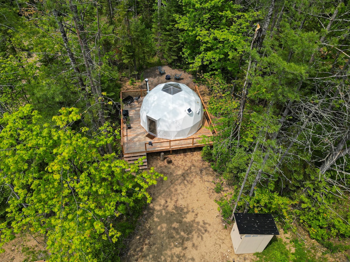 Fáilte go dtí cruinneachán suaimhneach na bá 🌲Tá an cruinneachán geoglampála iargúlta seo, atá suite go domhain san fhoraois, suite 10 nóiméad ar shiúl ó bhruacha Golden Lake. Titeadh i do chodladh faoi na réaltaí trí dhíon lánléargais, agus an ciúnas agus an dúlra thart timpeall ort. Bain sult as cistin lánfheistithe lasmuigh agus as seomra folctha sómasach lasmuigh ina bhfuil cithfholcadán téite. Cé go bhfuil sé go hiomlán neamhspleách ar fhuinneamh, tá gach compord tuisceanach ar fáil—ionas gur féidir leat do scíth a ligean gan éascaíocht, teas nó draíocht a chailleadh.