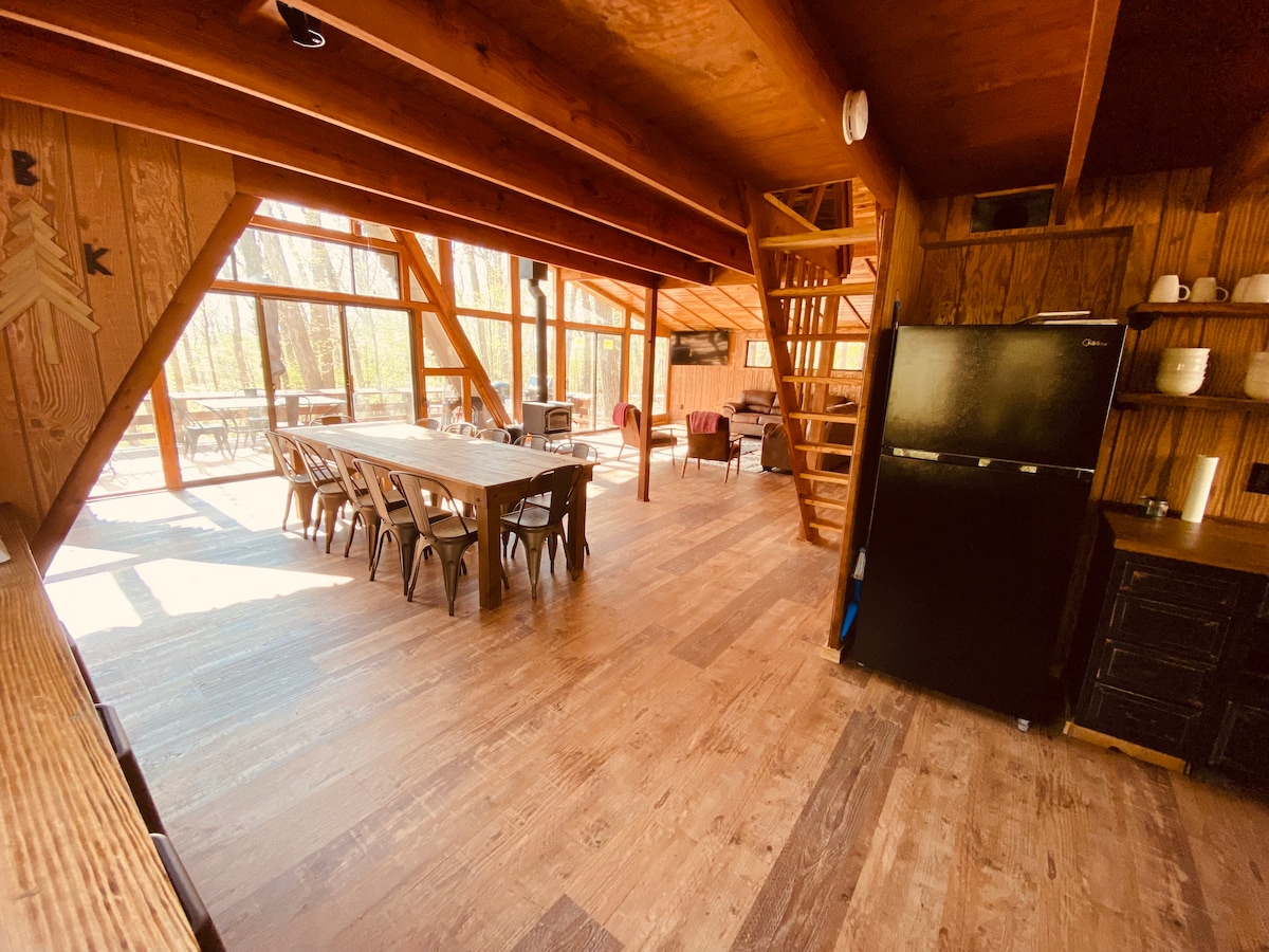 Lig do scíth sa chalet fairsing seo ina bhfuil síleálacha boghta, seomraí leapa móra, agus spás maireachtála oscailte. Ón deic thart timpeall ar an áit tá radhairc ar chnoic atá lán de chrainn agus ar an dúlra síochánta atá lán d'éin. Taobh istigh, rinneadh athchóiriú cúramach ar an sealla le gnéithe nua-aimseartha, ag meascadh compord le draíocht lóiste tuathúil. Nóiméid ón bhfánaíocht in Jasper/Ponca agus ón gcanúnóireacht ar Abhainn Buffalo. Níl sé ach 10 nóiméad ó bhialanna agus ó bhunriachtanais Harrison. Suite i measc seallaí eile ar bharr iar-ionad sciála le haghaidh saoire shuaimhneach.