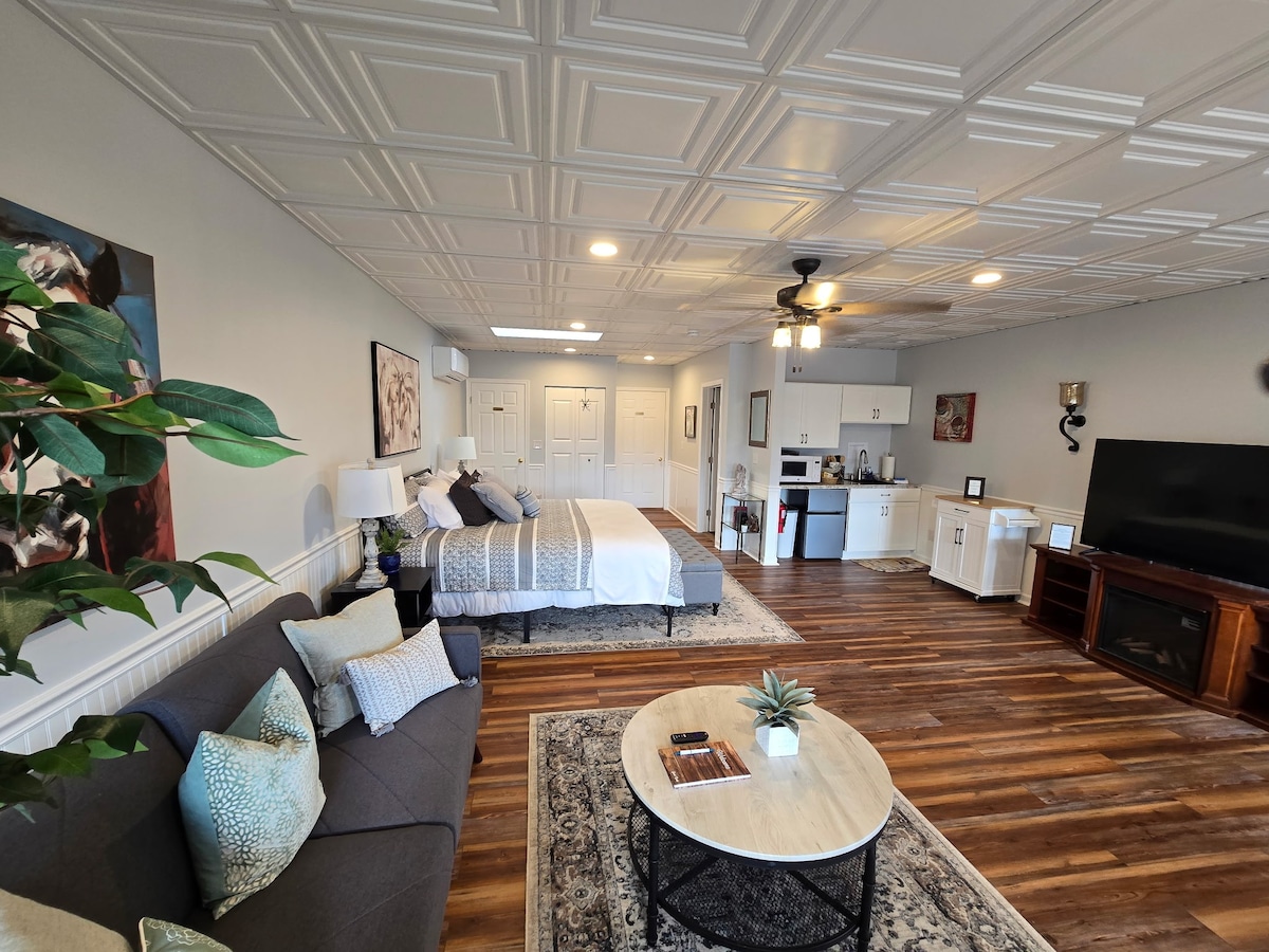 Tá an teach iompair stairiúil athchóirithe seo 2 bhloc ó lár bríomhar Harrisonburg. Tá an spás éadrom agus aerach le síleálacha cumasaithe agus soilse spéiriúla atá oscailte. Tá sé suite ar chúl cónaithe duilleach, le bealach isteach príobháideach agus páirceáil lasmuigh den tsráid. Tá campas bluestone JMU 10 nóiméad ar shiúl. Tá an spás seo curtha ar bun againn do raon aíonna: ó thuismitheoirí JMU a thugann cuairt ar a leanaí chuig daoine atá ag taisteal le haghaidh gnó atá ag lorg eispéireas níos uigeachtaí le compord sa bhaile.