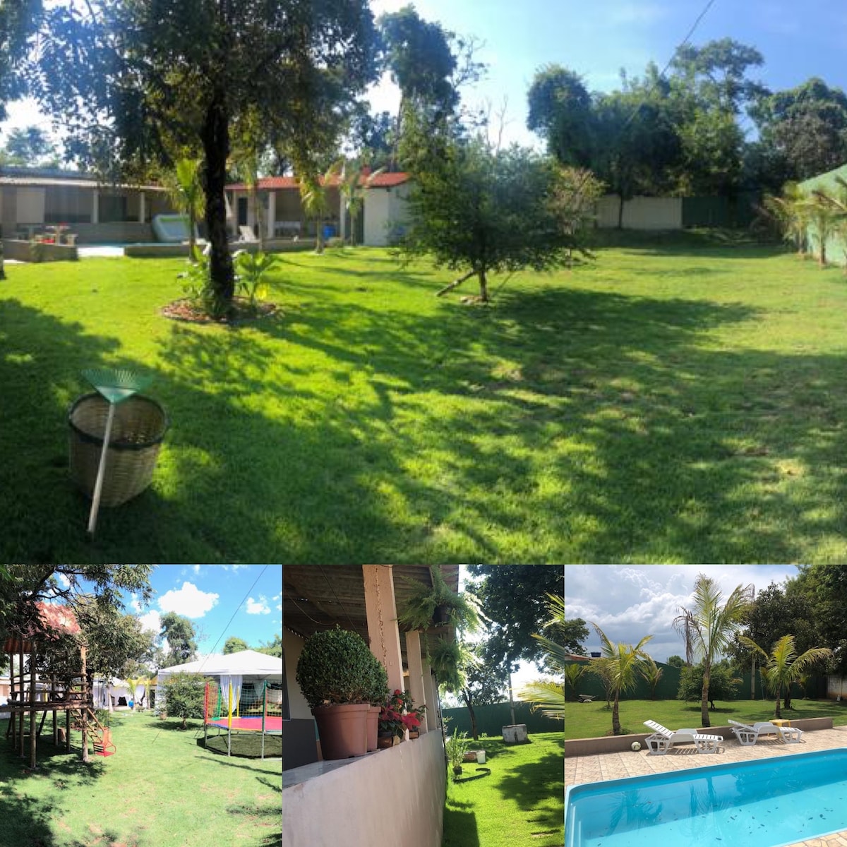 Chácara completa e aconchegante, ideal para famílias e grupos. A apenas 5 min da cidade, próxima aos bairros Castelo e Esplanada (Comunidade dos Cristais). Possui 3 quartos (1 cama casal, 2 solteiro, 1 viúvo e 1 colchão), sala de TV com sofá grande, 2 banheiros, casa toda avarandada, cozinha equipada, fogão a lenha e tradicional, churrasqueira, piscina, parquinho infantil e ampla área verde. Ambiente tranquilo e familiar.
