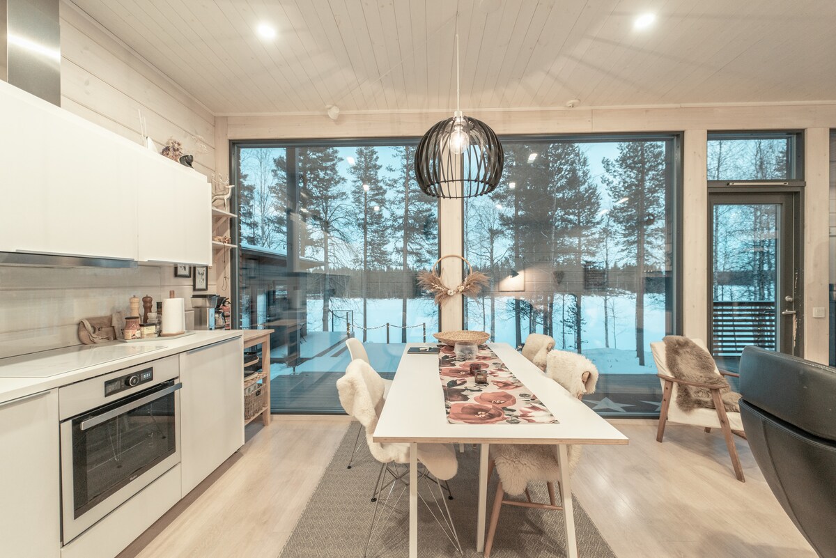 Fáilte go dtí Teach na Soilse Thuaidh, sealla sómasach le radharc ar an loch, seomra allais agus jacuzzi. Críochnaíodh an villa seo in 2024 agus is é an tearmann suaitheanta nua-liostaithe atá againn, a bhí rátáilte 5 réalta ag gach aoi roimhe seo. Deartha chun galántacht Lochlannach a chumasc le compord nua-aimseartha, tá radhairc iontacha ar an loch agus timpeallacht shuaimhneach i gcroílár Laplann. Tá conairí sciála, stad an bhus sciála agus saoráidí an tsráidbhaile go léir laistigh d'achar siúil, rud a fhágann go bhfuil Joiku an áit fhoirfe le fanacht le linn d'eachtra i Lapland.