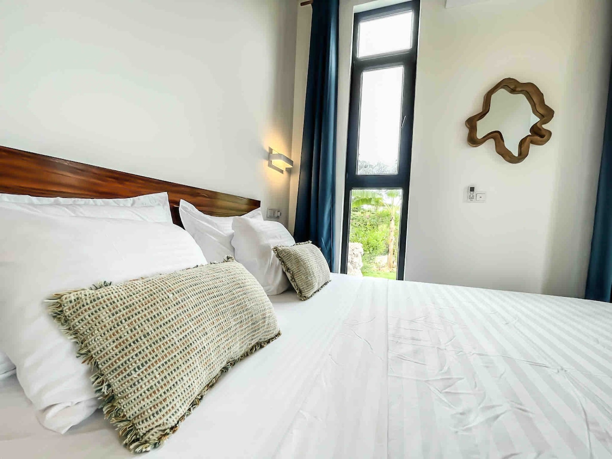 Suite in Paje, níl ach 6 nóiméad ó cheann de na tránna is fearr in Zanzibar, cuireann achar siúil chuig saoráidí bia agus siopadóireachta - villa cónaithe - atá neadaithe i ngairdín príobháideach lóistín ar fáil i stíl íostach le linn snámha phríobháideach lasmuigh, Wi - Fi saor in aisce, páirceáil phríobháideach saor in aisce. Cuireann villa úrnua cistin, cuisneoir, micreathonnán, aerchóiriú, teilifíseán ar scáileán cothrom, meaisín níocháin ar fáil atá feistithe go hiomlán. Tá seomra folctha príobháideach i ngach seomra ina bhfuil cithfholcadán.