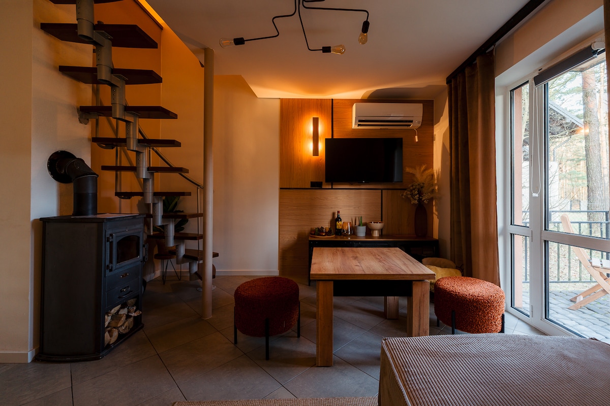 Is áit iontach í árasán ag a bhfuil bealach isteach príobháideach, páirceáil, áit scíthe agus spá chun do chuid ama saor a chaitheamh leis an bpáirtí, le do theaghlach nó le grúpa cairde. Tá 2 sheomra leapa san árasán, seomra dúnta agus seomra oscailte don seomra suí, seomra bia, cistin, seomra folctha agus balcóin rómánsúil ag breathnú amach ar an bhforaois agus ar ghráinseach capall. Fíric spraíúil: tá balla amháin den teach gaineamhchloiche seo atá céad bliain d'aois caomhnaithe ina bhunleagan. Is féidir leat amónaítí a bhfuil dea-bhail orthu a aimsiú air.