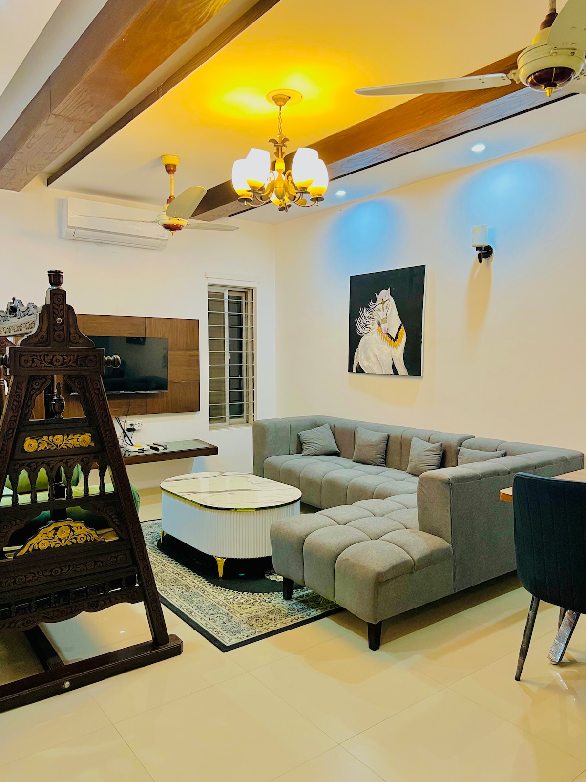 🛏️ 2 sheomra leapa atá feistithe go hiomlán le hurlár adhmaid atá feistithe le cuisneoir, Teilifís Chliste agus AC inchúlaithe. 🛋️ Tolglann fairsing le tolg compordach agus Teilifís Chliste 🍽️ Tábla bia do 6 curtha sa tolglann. 🛁 Seomraí folctha 🚿 2 sheomra folctha glan nua - aimseartha le huisce te 🧼 Feistithe le tuáillí,seampú agus earraí níocháin bunúsacha Wi — Fi 📶 ardluais — foirfe le haghaidh sruthú nó cianobair 🅿️ Páirceáil saor in aisce ar fáil ar an láthair 📍 Lonnaithe in F -11, Islamabad 👨👩👧 Foirfe do theaghlaigh, do lánúineacha nó d'aíonna gnó