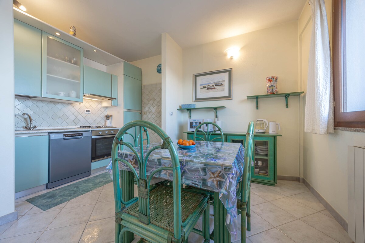 Tá vearanda ann le radharc iontach i dtreo Porto Rafael agus oileánra Maddalena. Lonnaithe díreach 300 méadar ó thrá La Sciumara agus 600 méadar ón lár agus ón gcalafort. Cúpla méadar ón árasán gheobhaidh tú an stad bus, an margadh, beáir agus bialanna. Is éard atá san árasán ná seomra leapa dúbailte, cistin seomra suí ina bhfuil leaba thoilg dhúbailte, seomra folctha, meaisín níocháin, oigheann micreathonnach, citeal, teilifíseán, línéadach tí. Tá páirceáil phoiblí saor in aisce 50 méadar ar shiúl.