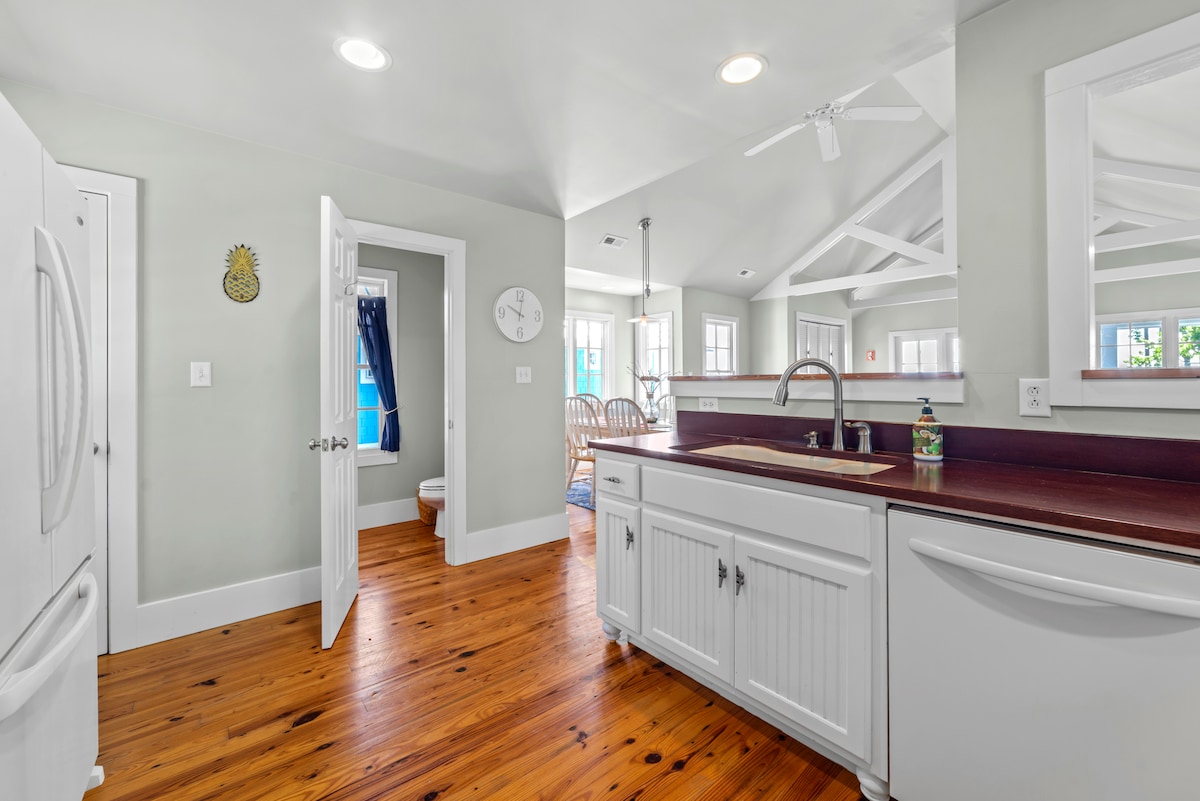 Lig do scíth sa spás socair galánta seo. Bain sult as d'fhanacht ag an teach nua - athchóirithe seo (2021) ina bhfuil an poll dóiteáin ealaíne, duga príobháideach, seomra gréine mór iata agus cumhdach iomlán timpeall an phóirse. Turas gairid 10 nóiméad chuig príomhchathair seoltóireachta NC le haghaidh bia, siopadóireachta & ceoil bheo ag an ngrúdlann áitiúil & Déanann Red Rooster oíche iontach amach tar éis iascaireacht fhlúirseach a dhéanamh díreach amach ón duga. Nó déan cócaireacht ar bhéile iomlán sa chistin ina bhfuil go leor soláthairtí & ith ag an mbord mór itheacháin tí feirme.
