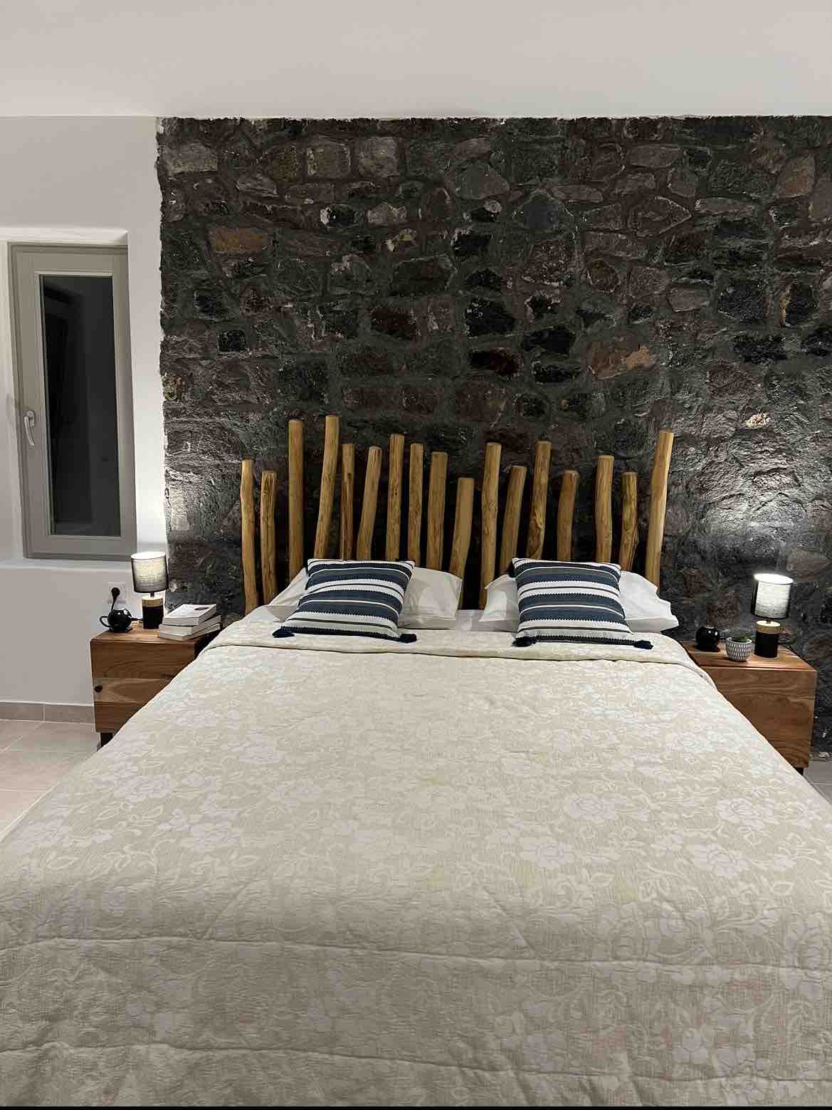 Villa lánfheistithe le áiléar. Leis an veranda leathan [40m ²] agus an meascán dhochoiscthe ag baint le cloch - taobh amuigh agus nua - aimseartha - taobh istigh, cuireann sé meascán agus meaitseáil fhoirfe den stíl ailtireachta thraidisiúnta áitiúil leis na rudaí is nua - aimseartha. Tá dhá sheomra leapa ann, an chéad cheann [14m²] á shnoí i gcroílár carraig Santorinean, le leaba choincréite, tráchtearraí agus foireann teilifíse, agus an dara seomra leapa [12m²] ina bhfuil leaba iarainn dhuibh le tráchtearraí.