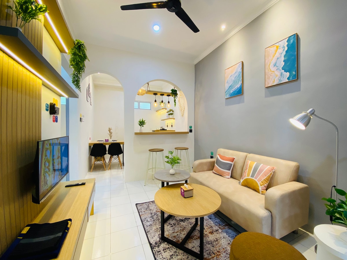 Fáilte go Rumah Tepi, teach saoire teolaí ar cíos in Pangandaran. Tá gairdín beag inár dteach galánta 2 sheomra leapa atá lán le luibheanna cistine agus plandaí fíonchaor, rud a chruthaíonn spás síochánta fáilteach. Ina theannta sin, níl ann ach siúlóid ghearr go dtí an trá! Táimid ceangailte go háisiúil freisin le Tepi Pangandaran, siopa caife gleoite inar féidir leat do scíth a ligean agus taitneamh a bhaint as an mbrú is fearr leat. Táimid ag súil go mór le tú a óstáil ag Rumah Tepi! 🖐🏼