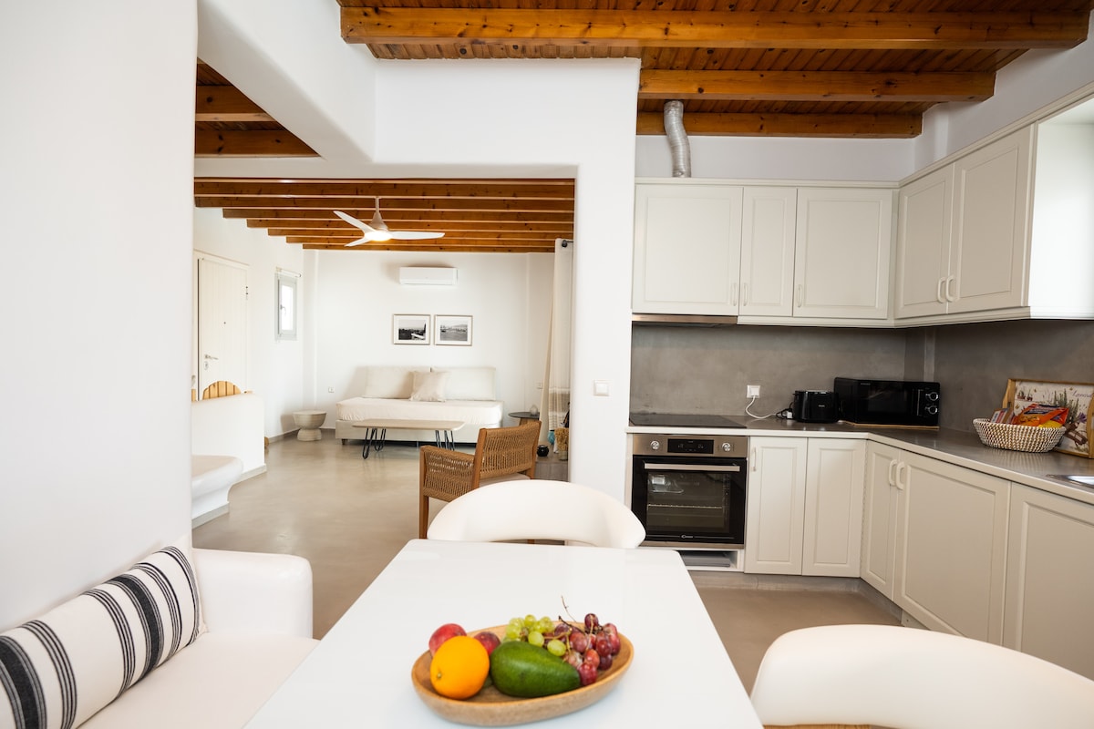 Fáilte go Cavo Blue Villas, villa 2 sheomra leapa atá suite i gcoimpléasc suaimhneach de chúig villa, agus iad go léir ag breathnú amach ar linn snámha chomhroinnte. Bain sult as radhairc ón ardán, a chuimsíonn an ceann is fearr ar Mykonos: an fharraige, sléibhte, linn snámha agus spéartha soiléire. Lonnaithe in aice le cladaigh ghainmheacha Elia Beach, tá cistin, áit itheacháin agus seomra suí teolaí ina bhfuil leaba bhreise ar an urlár uachtarach. Thíos staighre, tá dhá sheomra leapa ag fanacht, gach ceann acu ina bhfuil leaba dhúbailte chompordach ina bhfuil tochtanna atá cairdiúil don chomhshaol.