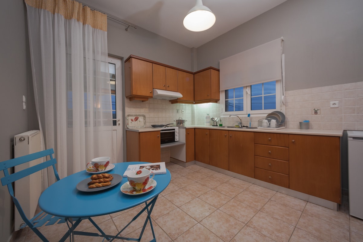 Simplicity, earthing, relaxation. We offer you a town apartment, just below the Castle, in the heart of the old town of Myrina. The apartment is part of a 1950s stone house in the historical center of the town and has been renovated in the summer of 2019! The market route with cafes, folk art shops and the Romeikos Gialos sandy beach, are two walking minutes away. The old harbor and the seafront promenade are five walking minutes away. Prime location to enjoy the old town vibes!