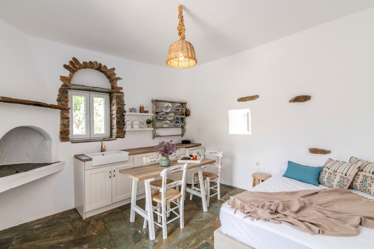 Tá an saol i Tinos fós unhurried, unflashy agus unspoiled Teach beag bán, le radhairc den scoth ag an bhfarraige súilíneach aegean, díreach os cionn an bhá iontach. Caith cloch ón mbaile. An meascán foirfe idir an nasc leis an dúlra agus compord an tsaoil nua - aimseartha. Cá bhfuil rud éigin le déanamh i gcónaí, fiú má tá sé ag déanamh rud ar bith. An cineál deiridh de thaisteal mall! Is brionglóid é Tinos a choinníonn ag filleadh don chuid eile de do shaol! Áit cosúil le haon áit eile, do dhaoine cosúil le haon cheann eile.