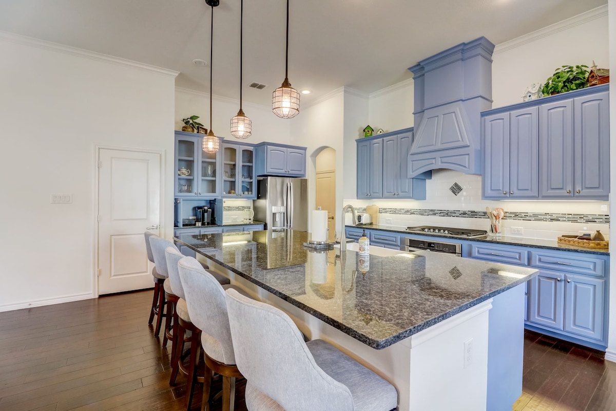 Tearmann garáiste síochánta 4BR, 2.5BA, 3 charr atá foirfe do theaghlaigh nó do ghrúpaí. Bain sult as teach fairsing ina bhfuil cistin iomlán, áit chónaithe theolaí, agus spás lasmuigh chun do scíth a ligean nó chun do scíth a ligean. Neadaithe ar bhóthar ciúin, díreach 5 mhíle ó thuaidh ó chearnóg Weatherford, is é an áit is fearr é chun scíth a ligean agus athcheangal a dhéanamh. Codlaíonn sé suas le 8 leaba rí sa mháistir agus leaba bhanríona i ngach seomra aíochta. Tá Wi - Fi, Teilifíseáin Chliste, agus gach compord sa bhaile feistithe sa teach.