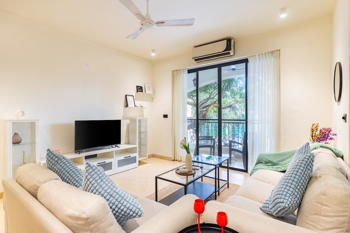 2 BHK Árasán le linn snámha, Wi - Fi, 8 nóiméad go trá Baga
