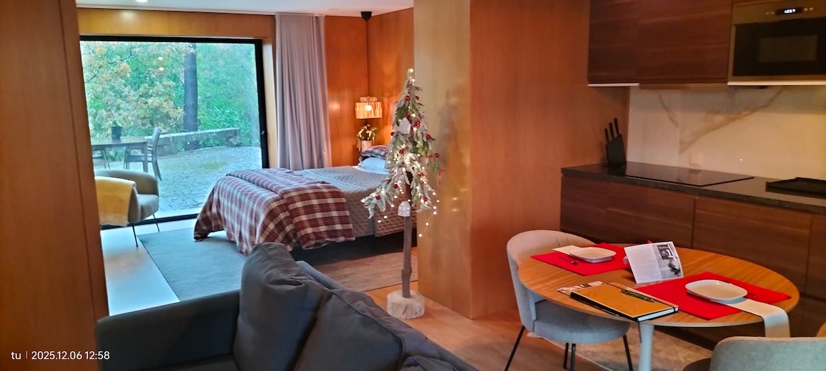 Tóg anail sa dúlra i dtearmann barántúil cois abhann, agus uisce thart timpeall ort, atá atógtha go héiceolaíoch ar mhuileann uisce XIV, a thairgeann compord agus beachtas inar féidir leat do scíth a ligean agus taitneamh a bhaint as fuaim an uisce máguaird. Scoir ón gcuid eile den domhan agus bain sult as an spás álainn seo in éineacht leis na daoine is mó a bhfuil grá agat dóibh, ag cruthú cuimhní cinn dodhearmadta. Beidh sé ina dheis den scoth chun 'Díthocsainiú Digiteach' a dhéanamh ar deireadh! Ar laethanta báistí, is féidir leat do scíth a ligean le seisiún scannáin sa bhaile.
