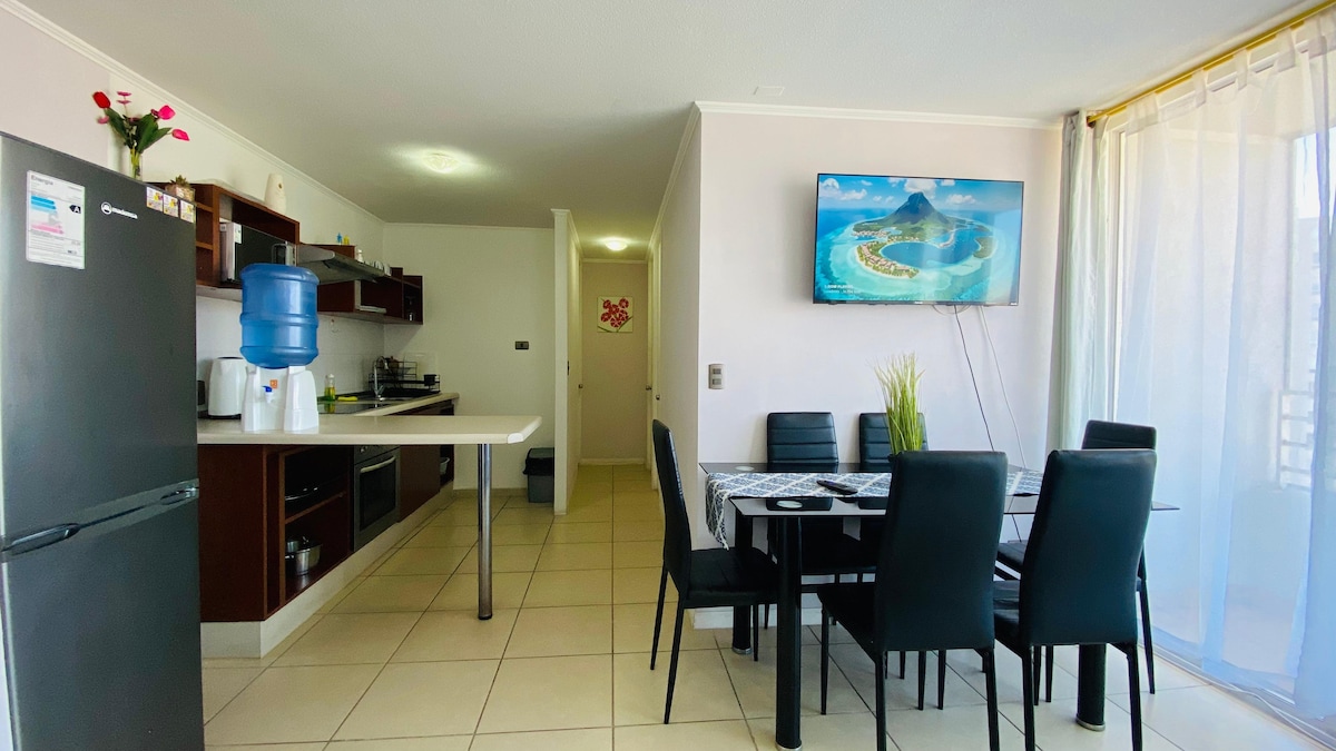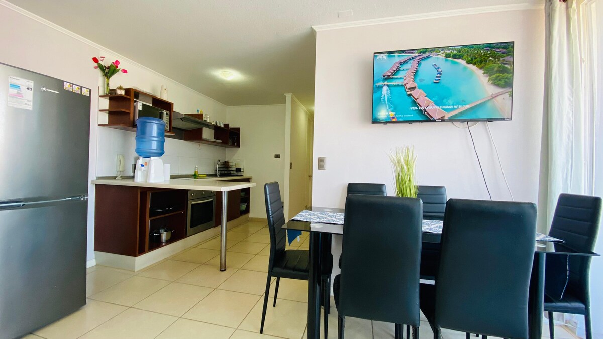 Céimeanna árasáin nua - chóirithe ó thrá La Serena agus Coquimbo, gar do shiopaí agus do bhialanna, tá 2 sheomra leapa, páirceáil, linn snámha, gríoscán, teilifíseán cábla agus idirlíon ann. Céimeanna ón Casino taitneamh a bhaint as Ní íocann tú as páirceáil mar go bhfuil páirceáil phríobháideach ann. Ní íocann tú as níochán, mar tá meaisín níocháin agus triomadóir san árasán. Feistithe, oigheann leictreach, déantóir caife, cumascóir, gríoscán leictreach. 2 Teilifís 40 agus 43 orlach