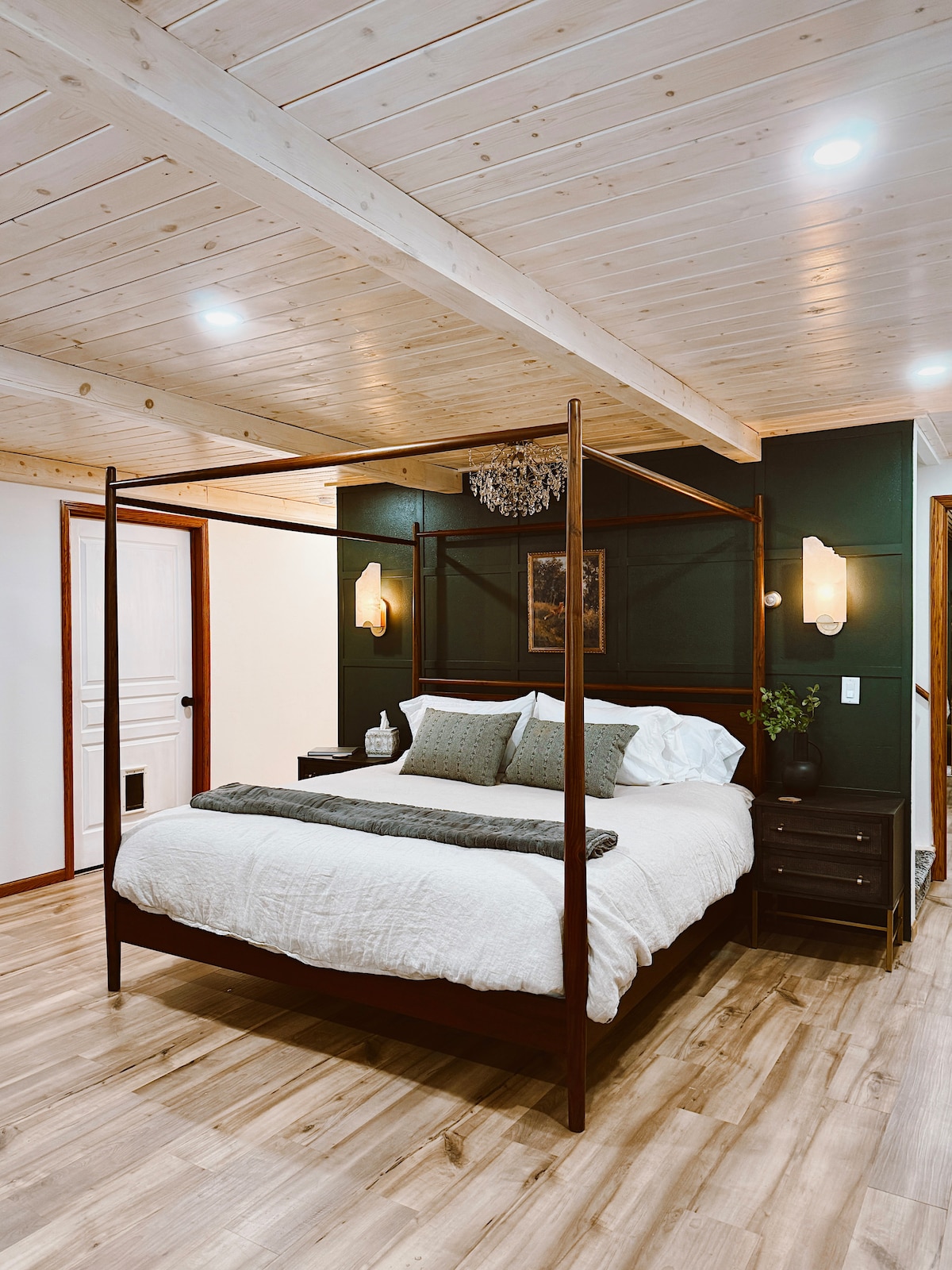 Uncover a story-book hideaway in the forested hillside of Pepin, WI. Sleeping Fox Suite is a spacious, lower-level retreat that comfortably hosts up to 4 adults plus 2 children—all on a single, stair-free floor. Step through your private entrance into 1,000 sq ft of whimsical woodland décor: fox accents, cozy movie theater space, and sauna and spa soaking tub accents. Stretch out in the king bedroom, full-size sleeper sofa, and a charming twin-over-twin bunk crafted just for little adventurers.
