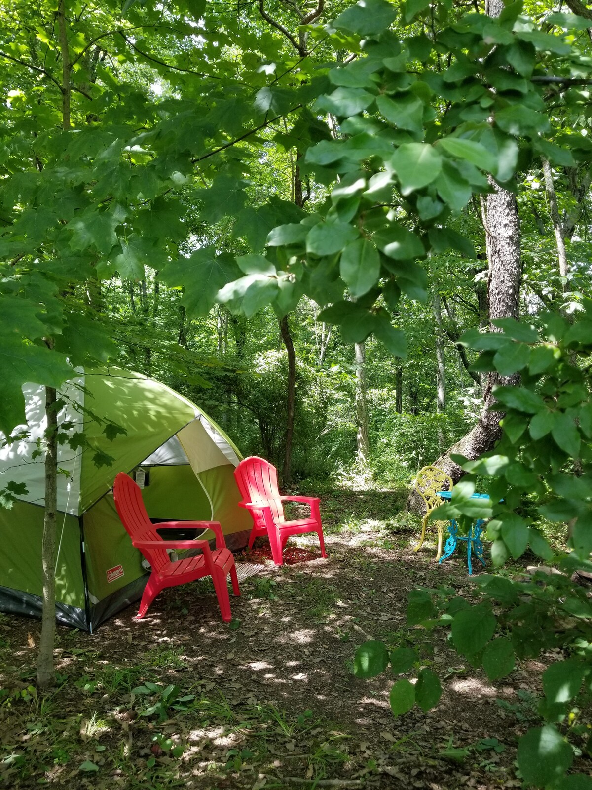 Reconnect to nature as you de-stress on this beautiful 300 acre property. Hike, read, take photos, yoga, stargaze, picnic or just relax. Our 6 person tent is 7 feet tall and very roomy. You'll have access to electricity and water and free parking. We provide a coffee maker, snack bars and fresh eggs ( chickens willing) . Outdoor camping shower (shared with cabin guests. Firepit and wood available. 5 hiking trails with creeks, rock overhangs and cliffs. please read house rules before booking