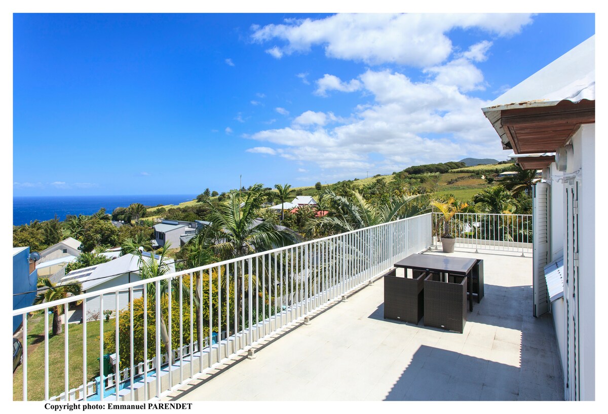 Villa só álainn le radhairc farraige 180°, agus radhairc sléibhe. Tá sé feistithe chun freastal ar 6 duine go compordach. Tugann a shuíomh ciúin síochánta rochtain éasca duit ar Downtown Petite - Inn, i dtreo thrá Grand - Anse, i dtreo chathair Saint - Pierre, agus i dtreo an deiscirt. Ligfidh linn mhór salainn duit do scíth a ligean aon uair is mian leat é a bheith i rith an lae agus an tráthnóna tar éis do thurais chuig an oileán.