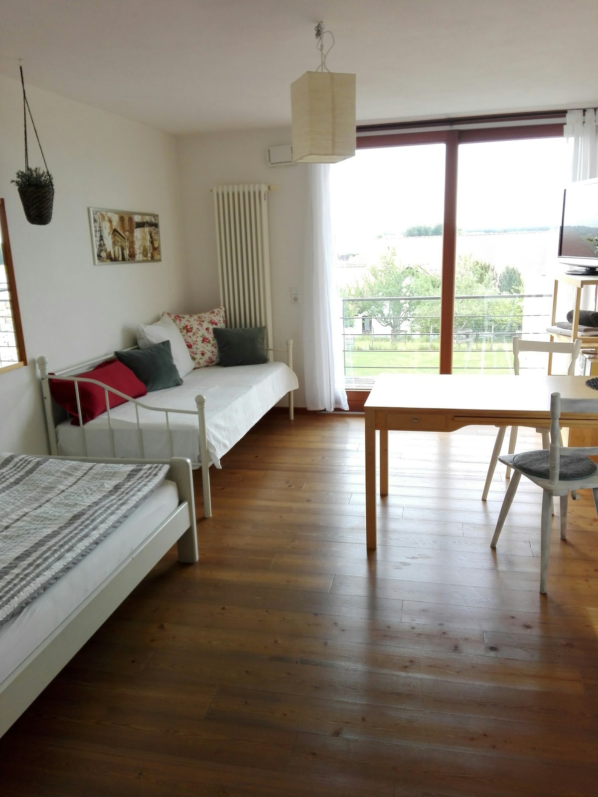 Sit back and relax - in this quiet, stylish accommodation. The view through the garden into the fields is immediately grounding. The small, newly furnished first floor apartment with terrace is a place of retreat and inspiration. The University Hospital and the lecture halls of the University of Ulm can be reached by car in 10 minutes and by bus in 45 minutes with or without transfer. Restaurants are on site and the city center (5 km) can also be reached by e-bike.