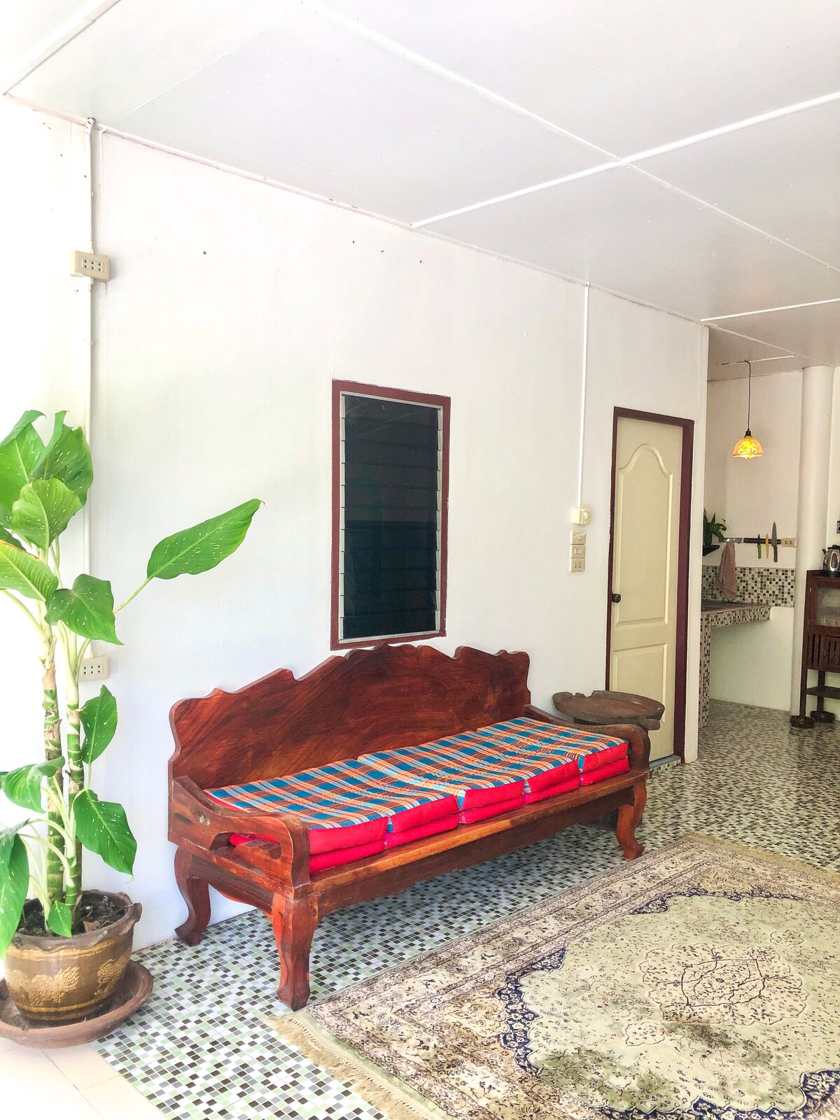 The house is situated in the Photaram district of Ratchaburi, 90km from Bangkok. It can be reached by bus to Nakhon Pathom then taxi. Or train to Photaram station. This beautiful house was built 2 years ago. I state that I love to draw back the curtains of my room in the morning and have the sunlight stream in and see the greenery of the vegetation outside. I now want to share the beauty and serenity for others to have a relaxing stay.