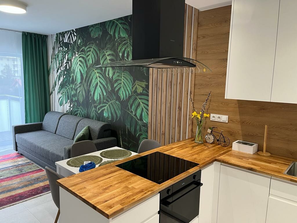 Árasán compordach, lánfheistithe i bhfoirgneamh nua. Seomra suí ina bhfuil cistin oscailte roinnte ina áit itheacháin agus suí. Tá leaba mhór agus vardrús fairsing sa seomra leapa. Tá vardrús siúil isteach ann freisin mar spás stórála breise. Tá siopaí, bialanna agus caiféanna in aice láimhe Trealamh: aerchóiriú, meaisín espresso, citeal, iarann, clár iarnála, meaisín níocháin Ag dul ó Aerfort Chopin 20 nóiméad tacsaí 50 nóiméad cumarsáid ó Aerfort Modlin 50 nóiméad tacsaí 120 nóiméad cumarsáid