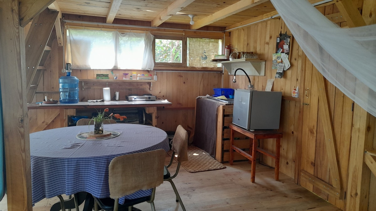 Cábán cluthar príobháideach inar féidir le beirt fanacht, gan ach siúlóid 2 nóiméad ó lár an bhaile. Tugann an gairdín álainn príobháideacht agus tá breis agus 50 speiceas éan ann. Tá cistin iomlán, seomra leapa ar leith, seomra folctha agus meaisín níocháin sa chábán. Tá Wi - Fi ag an gcábán freisin. Is saoire iontach é do dhuine amháin nó beirt agus an dúlra thart timpeall orthu.