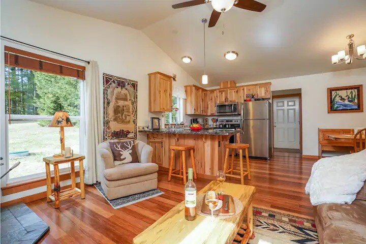 DÍREACH AG FANACHT LEAT! Fáilte chuig Cábán "Wily Coyote ". Tógadh an cábán 1,000 troigh cearnach seo as an nua in 2020 agus tá sé suite ar 3 acra álainn in Ashford, Washington. Níl sé suite ach 6 mhíle ón mbealach isteach siar ó dheas go Páirc Náisiúnta Mount Rainier. Tá 2 sheomra leapa ann (leaba rí agus leaba bhanríona), 2 sheomra folctha iomlána, agus tá suas le 4 sheomra codlata ann. Soláthraíonn sé an bealach foirfe do theaghlach nó do lánúin. Aer sléibhe glan, briosc agus spéir lán de réaltaí inar féidir leat scíth a ligean agus scíth a ligean sa tobán te boilgeogach!