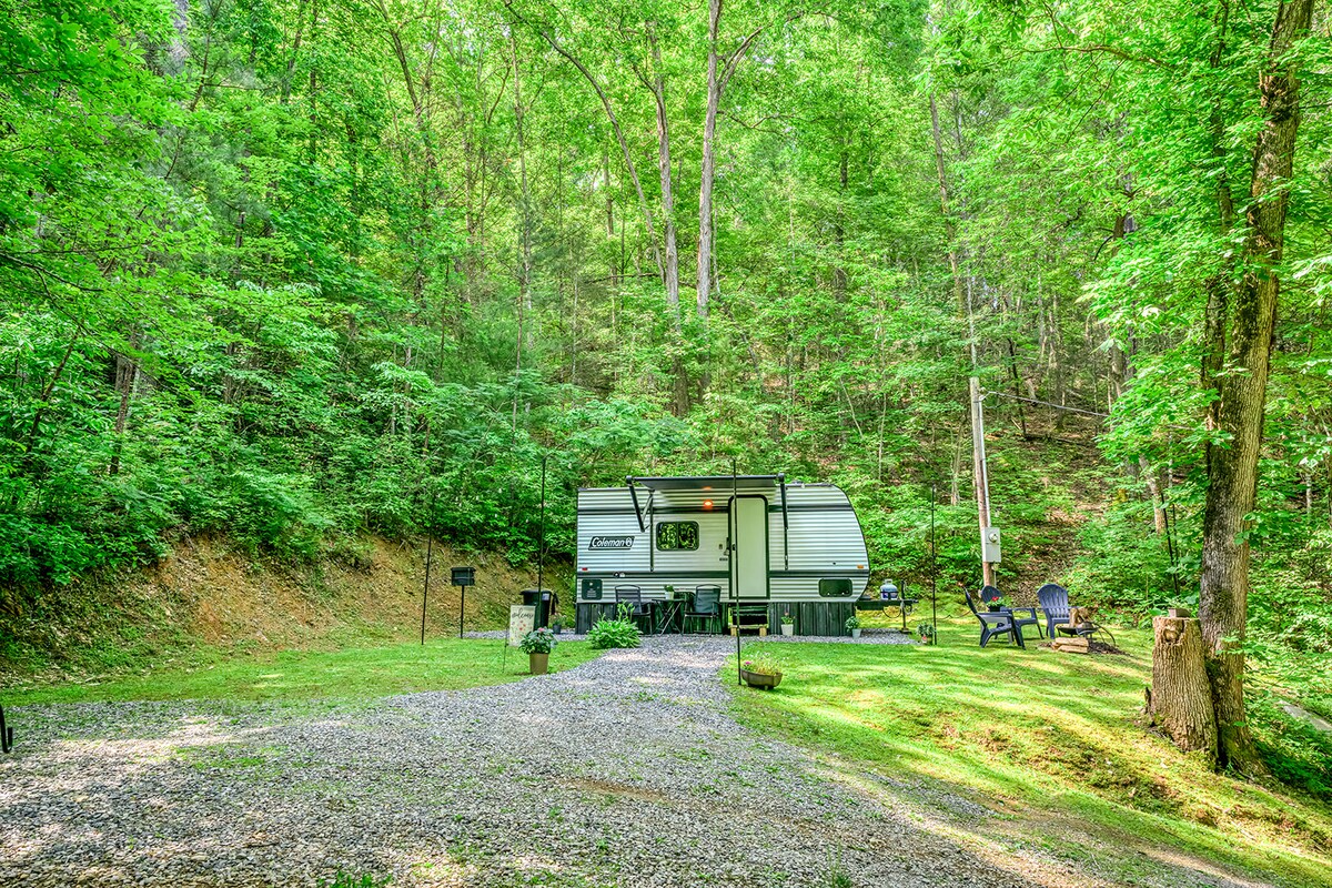 Haley's Smoky Mountain Haven. Is cinnte go mbainfidh an t - aoi taitneamh as fuaimeanna síochánta an dúlra ag ár RV atá suite go díreach ar shruth Smoky Mountain. Taobh istigh dár 36' RV gheobhaidh tú gach compord ón mbaile. Seomra leapa amháin le leaba na Banríona, seomra folctha iomlán, Seomra suí le 2 recliners agus tolg, cistin ina bhfuil go leor soláthairtí. Lasmuigh gheobhaidh tú poll dóiteáin chun taitneamh a bhaint as ag oícheanta ag éisteacht le fuaimeanna an tsrutha le paitió príobháideach. San ionad saoire gheobhaidh tú 2 linn snámha, stua, níochán, galf putt, agus i bhfad níos mó