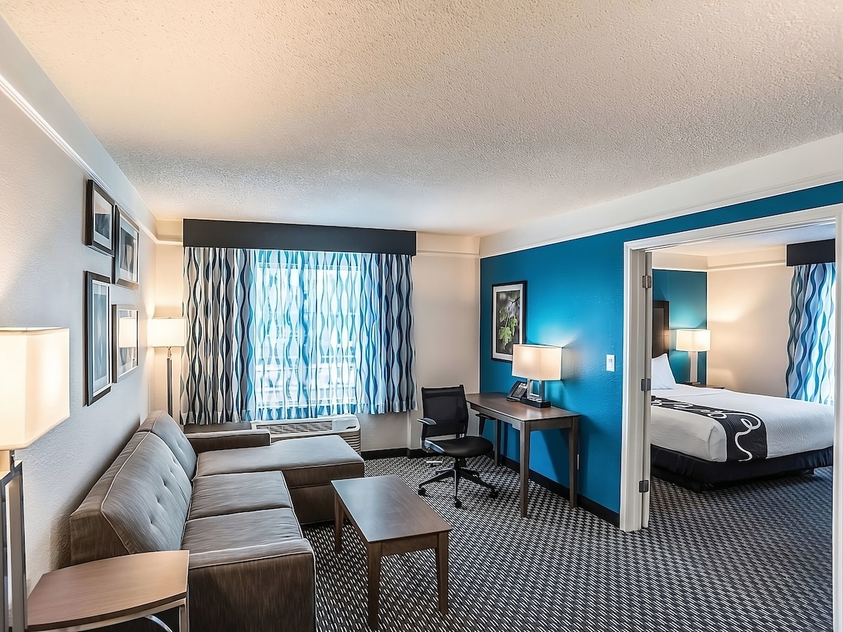 Experience extra space and comfort in our 550 sq ft rooms—twice the size of a typical hotel room. Each room features a separate bedroom, a cozy living room, a dining area, and a fully stocked kitchen with a dishwasher and in-unit washer/dryer. Our Queen Bed Retreat is thoughtfully furnished for your comfort, designed to provide both relaxation and convenience—all at one inclusive price. Pool-view, with nightly rates available and special discounts for monthly stays.