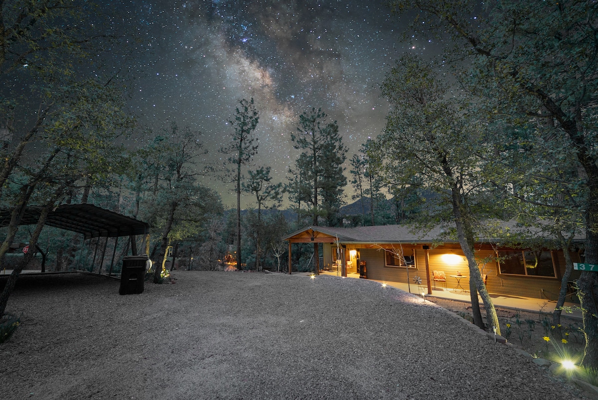 Cábán aonleibhéil nua - aimseartha, ailtireachta go hálainn agus fairsing 2 leaba/2 sheomra folctha i bpobal uas - scála geataithe. Suíonn sé ar thaobh an tsléibhe le radharcanna dochreidte ar fad. Tá an teach i cul - de - sac cúlráideach, le cnoic rollta pábháilte le haghaidh siúlóide/rothaíochta nó le feiceáil. Téigh ag fánaíocht go barr Chnoc Ruin, áit ar féidir leat Ruins Meiriceánach Dúchasach a fheiceáil nó suí sa phaitió cúil agus taitneamh a bhaint as na cuairteoirí Elk. Níl ach 1 uair 45 nóiméad ó cheantar Phoenix, Leibhéal 2 (50A) Luchtaire EV ar an láthair. De ghnáth 20 deg níos fuaire ná ceantar Phoenix.