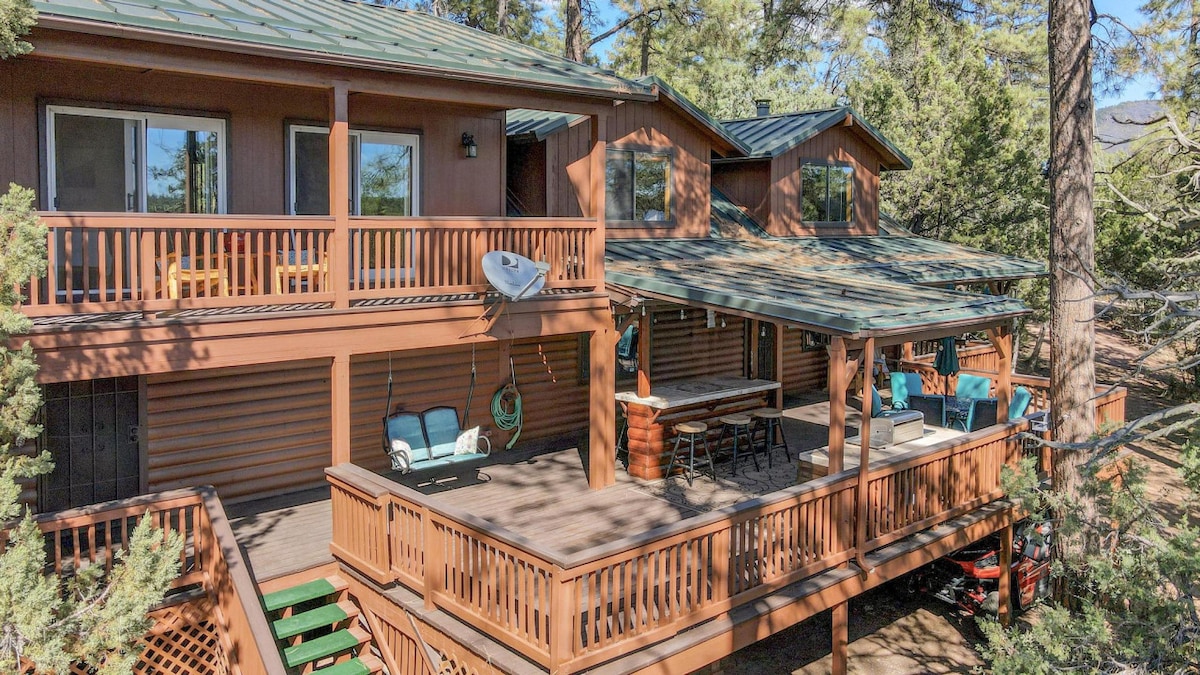 Modern, beautifully architected and spacious 2 bed/2 bath single-level cabin in a gated, upscale community. Sits on side of mountain with incredible views all around. Home is in a secluded cul-de-sac, with paved rolling hills for walking/biking or sight seeing. Hike to the top of Ruin Hill where you can see Native American Ruins or sit in the back patio and enjoy the Elk visitors. Only 1hr 45min from Phoenix area, Level 2 (50A) EV Charger onsite. Typically 20 deg cooler than Phoenix area.