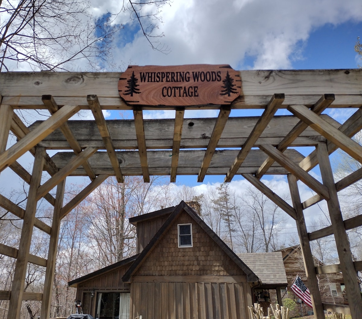 Cábán saincheaptha álainn a tógadh laistigh d'achar siúil nó marcaíocht ar ais capall chuig FORC MÓR THEAS. Chomh maith leis sin suite laistigh de 15 nóiméad A BRIMSTONE REC. Tá sé suite go lárnach idir Bandy Creek, Leatherwood Ford, agus Campa an Stáisiúin. Tá cosán BSF inár bpobal do chapaill/siúlóirí/rothair/cadhcanna. Tá áit chodlata ann do 5+ go héasca le go leor spáis eile d'aíonna breise ag baint úsáid as cots/tocht aeir. Coinnigh do chapaill i DO scioból stalla díreach in aice leis an teach. Tiomáint ciorcail do leantóirí, tarlóirí bréagán, trealamh