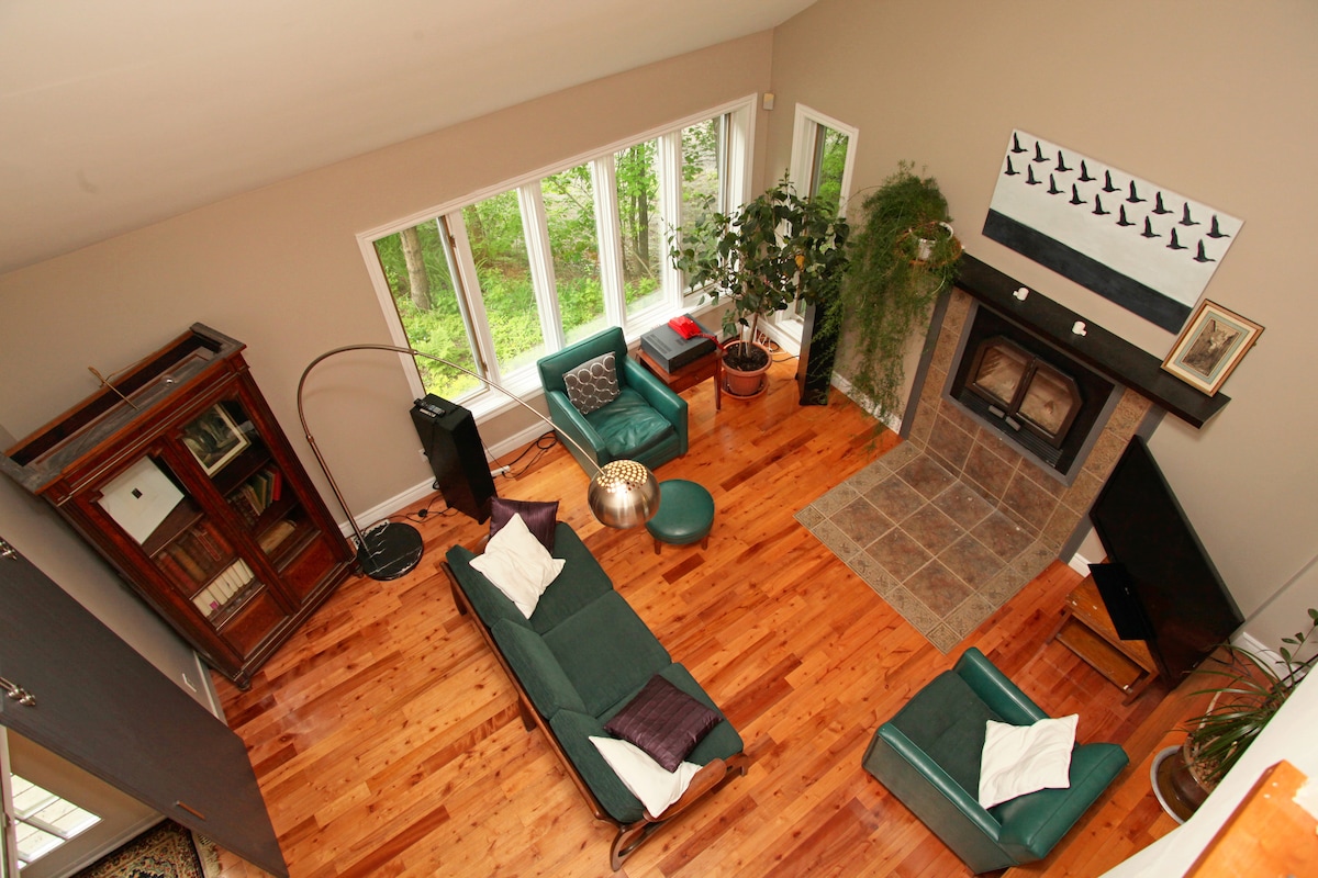 Tearmann draíochta i gcroílár Old Chelsea Village. Calma, príobháideach, ach céimeanna ar shiúl ó ár restos fíneáil. Is siúlóid 8 nóiméad é Le Nordik Spa, tiomáint 3 nóiméad. Páirc Gatineau go litriúil béal dorais le haghaidh fánaíochta, rothaíochta, siúlóireachta sneachta, sciáil (síos an cnoc+tras - tír), snámh, scátáil, curachóireacht, cadhcáil, clárchéaslóireacht nó díreach ag fánaíocht thart sna coillte glórmhara . Breathnaíonn do radharc amach thar ár reilig stairiúil, mar sin, tá na comharsana ciúin, agus ó – ar luamar an t - eas? CITQ # 309902