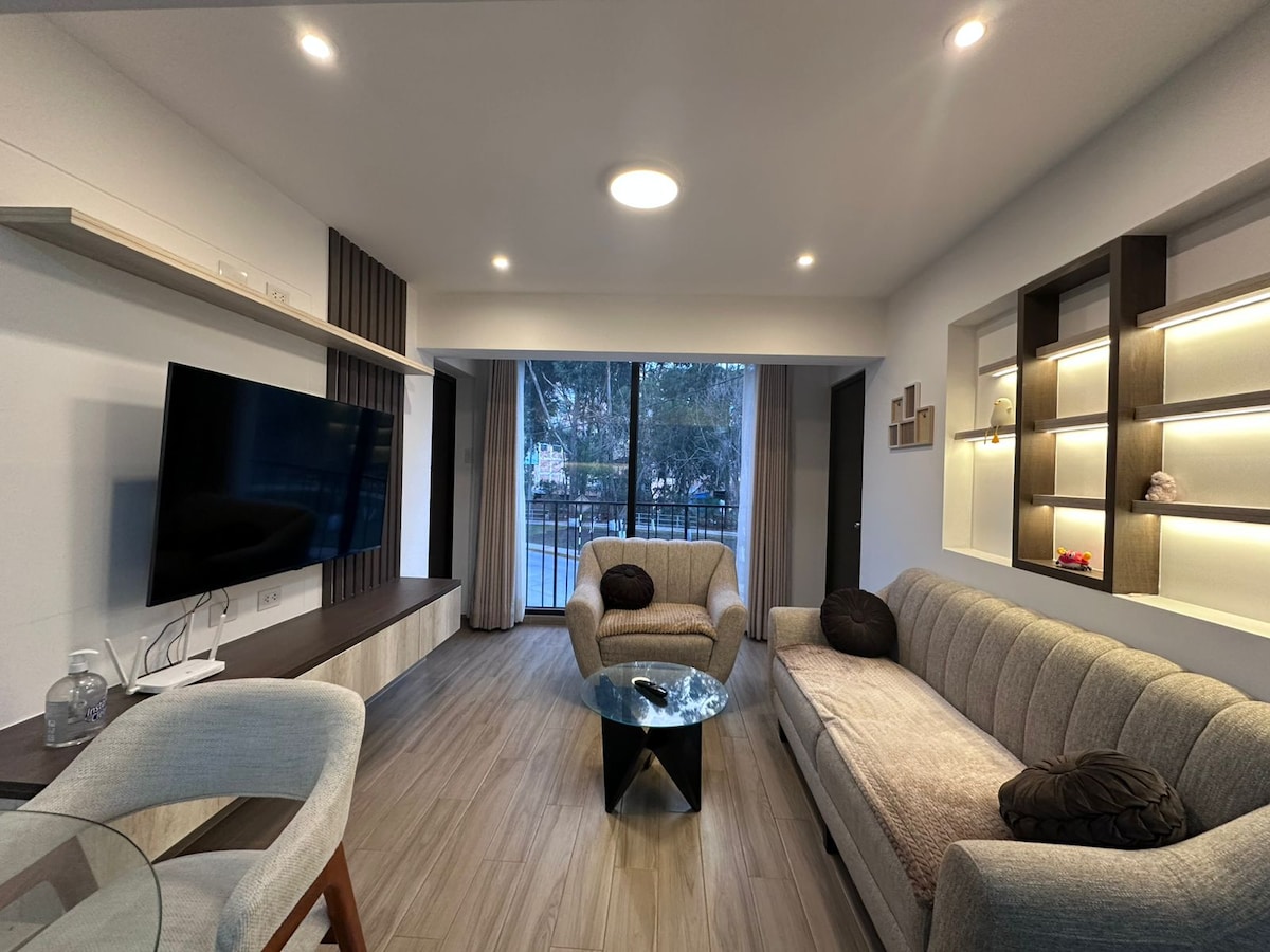 Es un acogedor minidepartamento completamente amoblado que brinda todas las comodidades necesarias. Este espacio cuenta con dos áreas principales: una amplia sala con cómodos sofás, una cama de dos plazas, un amplio closet y una televisión incluida, además de un baño. Estratégicamente ubicado en las cercanías del centro de la ciudad, se encuentra en un entorno tranquilo y luminoso, creando así un ambiente acogedor. Ideal tanto para personas solas como para pareja.