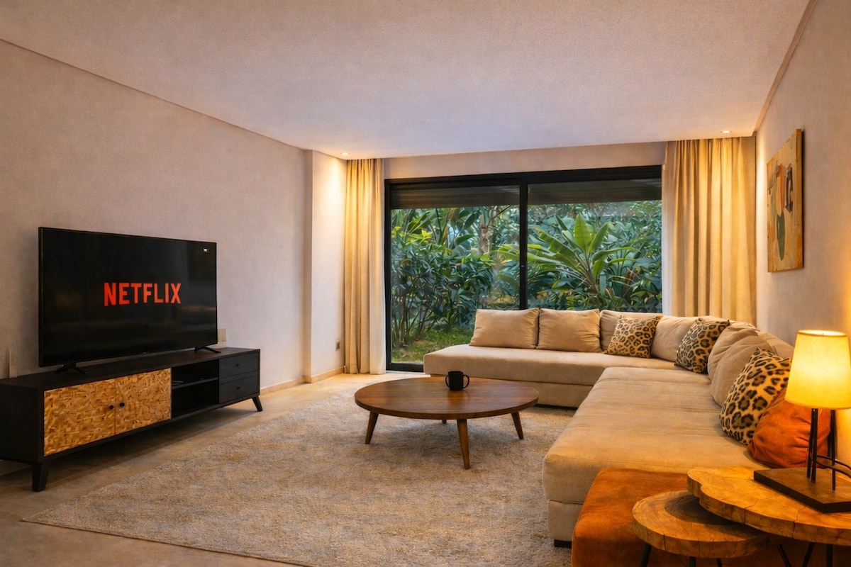 Lig do scíth agus lig do scíth ó ghnóthas agus ó ghnóthas lár na cathrach san árasán úrnua 1 sheomra leapa seo. Lonnaithe ar urlár na talún le gairdín príobháideach, gan ach achar siúil 10 nóiméad ó Porte 13 i gceantar Ain Diab (trá agus láthair surfála) Casablanca. Feistithe go hiomlán agus oiriúnach do lánúin. Tá an stiúideo suite taobh istigh d'áit chónaithe le slándáil 24/7. Sábháilte agus síochánta, le go leor glasraí agus páirceáil faoi thalamh.