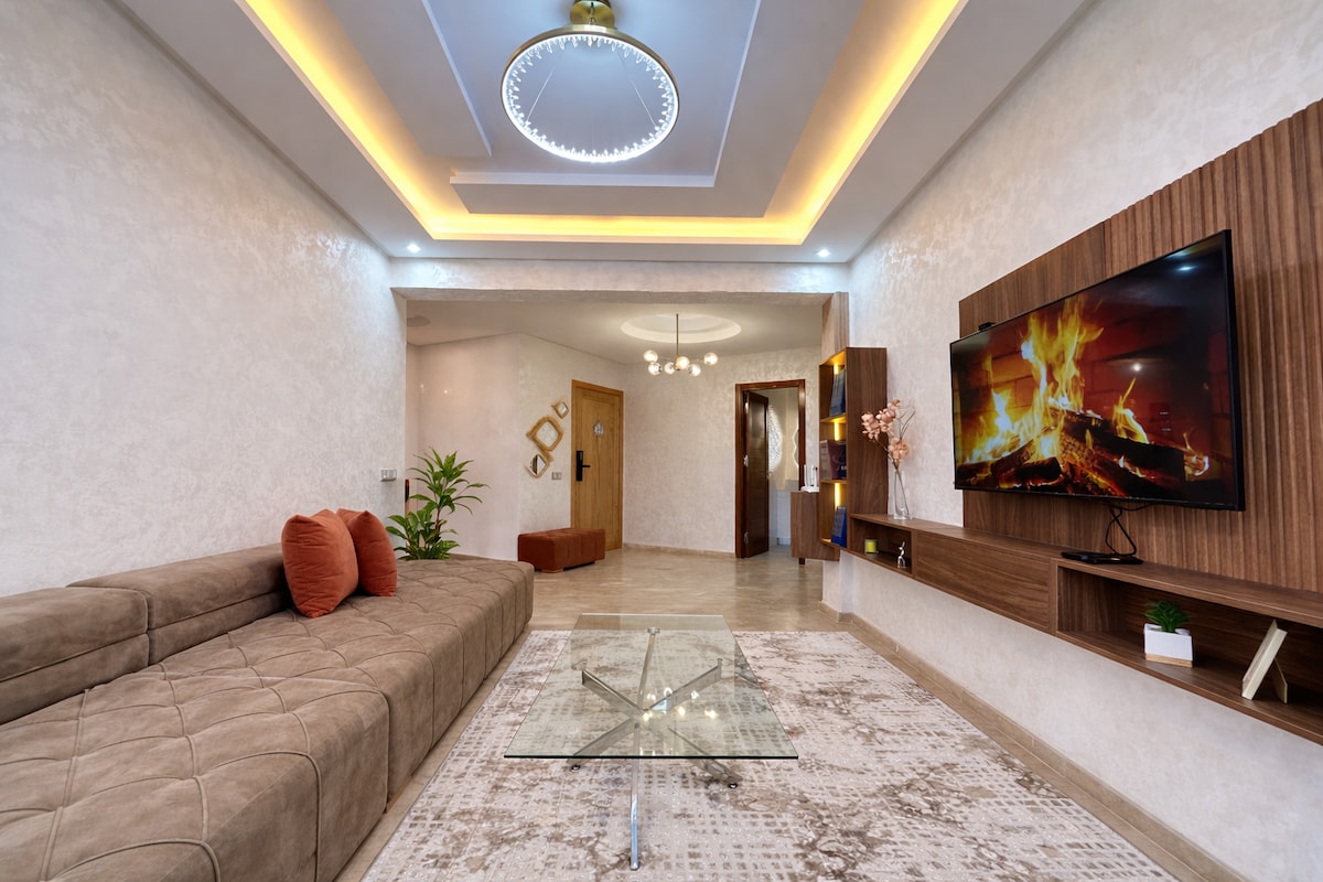 Welcome to our modern, cozy apartment where comfort meets style. Enjoy a bright living room with navy sofas, a sleek kitchen, and a dining area for six. The space includes fast WiFi, a flat-screen TV (Bein sports, IPTV service), and elegant décor. Large windows fill it with natural light and calm energy. Just 3 mins to the train station, 2 mins to Carrefour and 5min driving to the beach & City Center… ( not allowed for unmarried couples) Perfect for relaxing short or long stays.