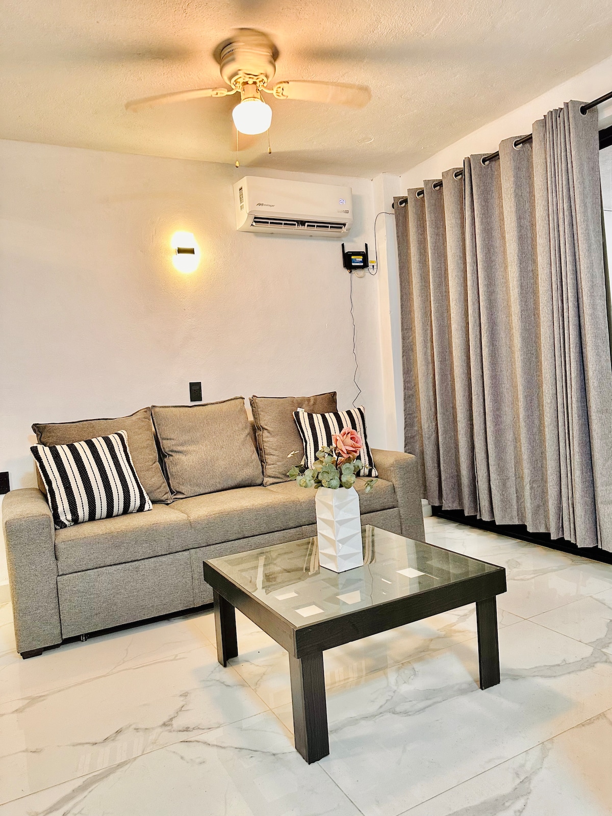 Stiúideo álainn (seomra) leis an gcompord go léir, soilsiú maith agus suíomh den scoth, cúpla bloc ón trá, in aice leis an ionad, bialanna, siopaí grósaera, ospidéal, bainc, iompar poiblí, srl. Tá an seomra ar urlár 2ª agus tá leaba de mhéid banríona, tolg, A/C, cistinéad feistithe le minifridge, gríoscán de 3 dhóire, micreathonnán, déantóir caife, tóstaer, pannaí, srl. Seomra folctha príobháideach, teilifís plasma de réir cábla, Wi - Fi, seirbhís ghlantacháin, rochtain ar niteoir / triomadóir, paitió coiteann le linn snámha, palapa, BBQ, srl.