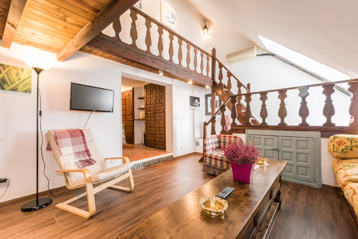 Árasán álainn geal atá suite ar Calle Cava Baja, 2º gan ardaitheoir, cuid bhunúsach de stair Mhaidrid, sráid a bhfuil cáil mhór uirthi faoi láthair mar gheall ar a lán áiteanna tapas, tithe tábhairne agus bialanna. Tá La Cava Baja ar cheann de phríomhshráideanna chomharsanacht La Latina, “an chomharsanacht tapas quintessential ”, an chuid is sine agus is traidisiúnta de Mhaidrid, ceantar a bhfuil tóir air ar an Domhnach i ndiaidh an chosáin do Mhaidrid agus do thurasóirí araon.