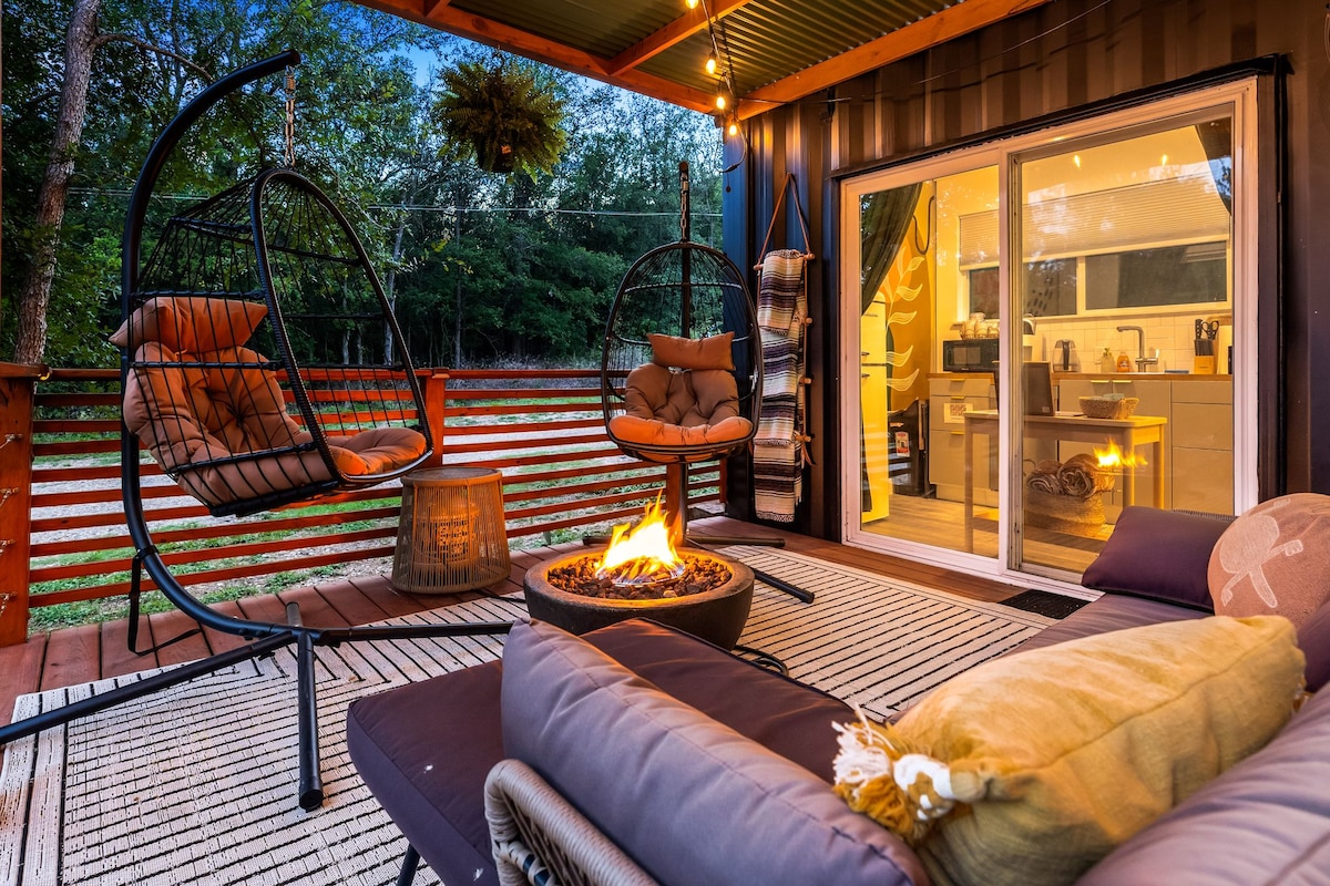 D'óisias uirbeach príobháideach—teach coimeádáin iontach atá lán le healaín, áit a dtagann fuinneamh Austin le haonarán suaimhneach. Lig do scíth ar an deic fhairsing i gcathaoireacha uibheacha crochta, bailigh thart ar theallach dromaí Solo faoi réaltaí Texas, nó bí ag ithe al fresco in aice le múrphictiúir bhunaidh leis an ealaíontóir Rachel Smith as Austin. Níl sé ach cúpla nóiméad ó lár na cathrach ach tá crainn thart timpeall air. Tá leaba rí, cistin iomlán, gríoscán allamuigh agus spás suaimhneach maireachtála ann. Foirfe do shaoirí gearra rómánsúla, saoirí sa bhaile agus deireadh seachtaine le féilte ceoil.