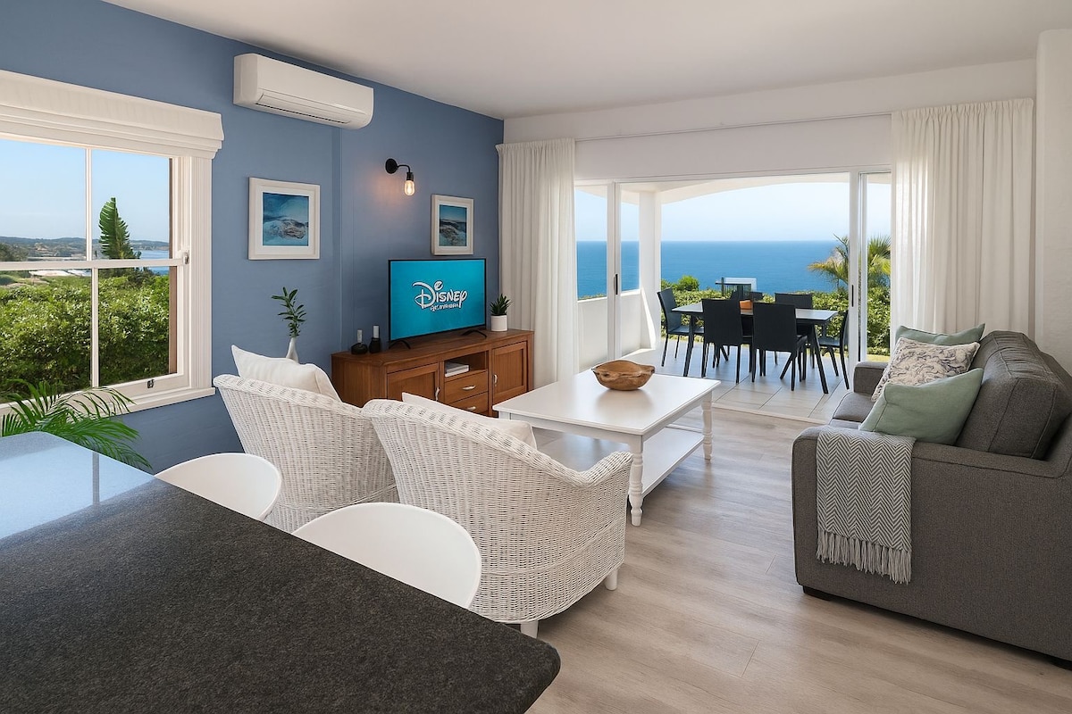 Immaculately presented apartment offering privacy, security and luxurious open-plan living in an exclusive development comprising 12 units only. Located on top of a hill with spectacular sea views, the apartment includes a large lounge that leads to a partially covered entertainment deck with splash pool, and 3 spacious double bedrooms all with en-suite bathrooms. Breaker sea views overlooking Thompson's Bay.