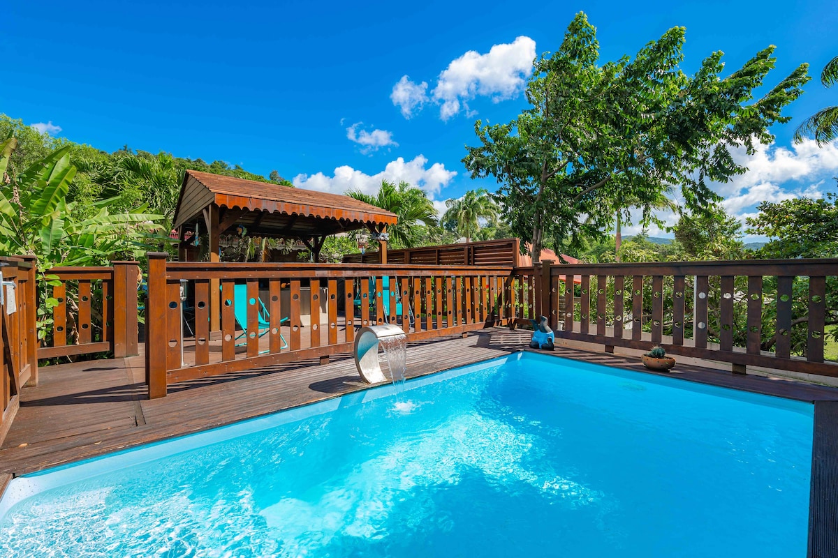 Cuirimid bungaló adhmaid ar fáil duit atá suite go hidéalach in Bouillante ag breathnú amach ar Mhuir Chairib, áit ar féidir leat iniúchadh a dhéanamh ar an gcósta - sous - le - teagmhas. In aice le spriongaí teo sulfair (siúlóid 6 nóiméad) le haghaidh scíthe uasta, 10 nóiméad ó thrá Malendure (anaclann cáiliúil faoi uisce Cousteau) agus gar do thránna áille agus cosáin fánaíochta iomadúla tríd an bhforaois bháistí. Beidh amhrán na bhfroganna ag racáil d'oícheanta, cuirfidh spéaclaí luí na gréine gliondar ar do shúile!
