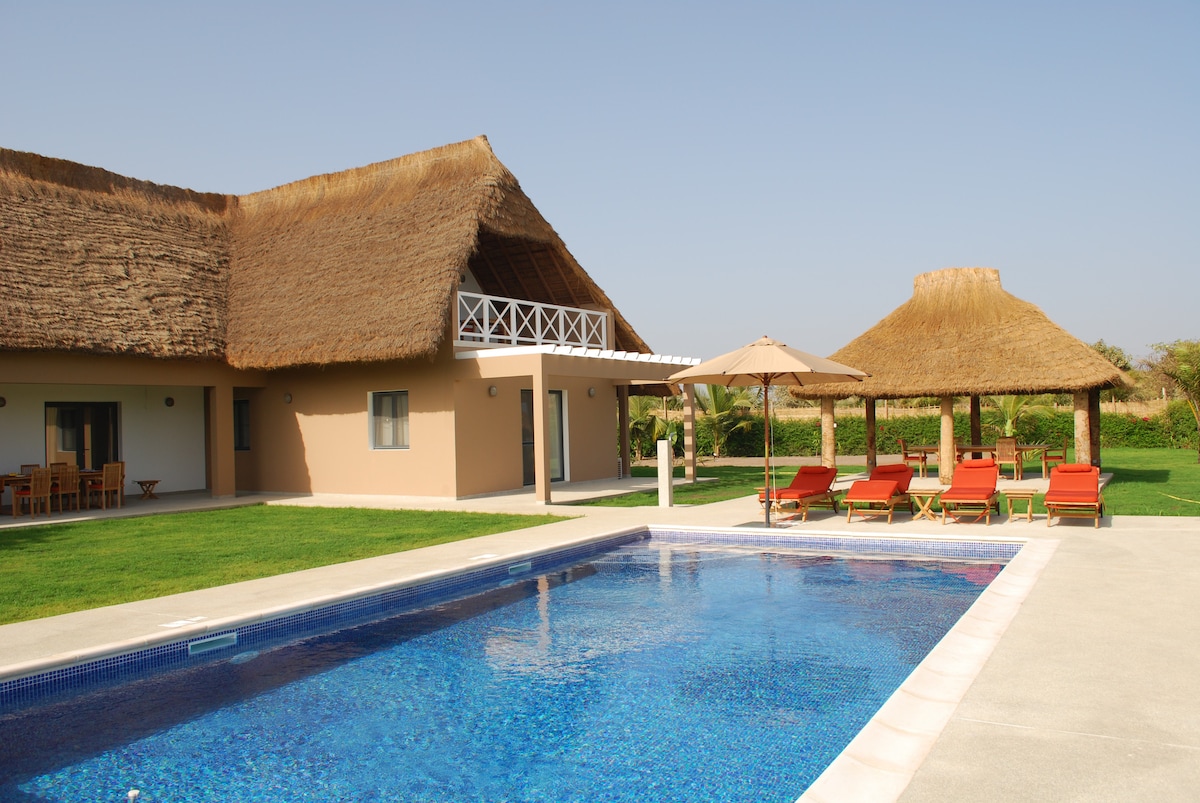 A 4.6kms du centre du Cap Skirring, villa pieds dans l'eau avec piscine, océan et nature, pour 6 adultes, 3 chambres, 3 lits (1 king,1 queen, 1 double, 1 lit bb) 4sdb, dressings,wifi, parc d'1 hect en terrain plat, accès privatif à plage, literie parfaite contre maux de dos, calme et à l'abris des regards+plage "privée". Villa entièrement équipée. Personnel sur place, Chef, masseuse,baby-sitter sur demande.8 ans d'expérience en accueil voyageurs.Possibilité de privatiser le domaine pour 11 pers