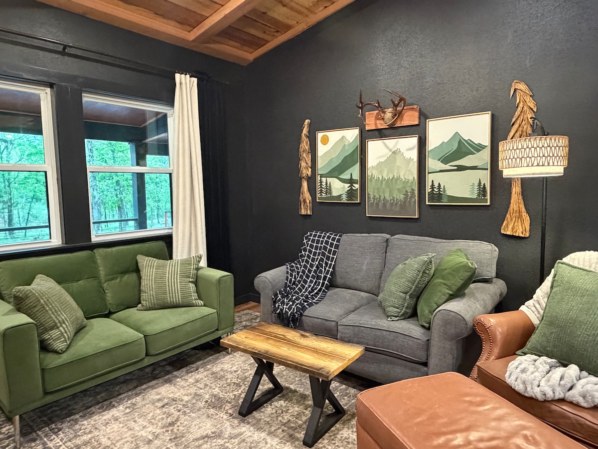 Don Wild at Heart Who Crave Compord — Just minutes from Wolf Pen Gap ATV trails, Evergreen Dreams pair Ouachita Mountain adventure with spa - level luxury. Caith an lá ag fánaíocht, ag marcaíocht, nó ag dul sa tóir ar easanna, ansin fill ar thobán te céadair faoi na réaltaí, sabhna infridhearg, cithfholcadán lasmuigh, tobán ar maos, agus cithfholcadán siúil isteach triarach. Taobh istigh, bain sult as tochtanna Casper Dream, línéadach tí bog, agus tolg Joybird atá glas ar fhoraois.