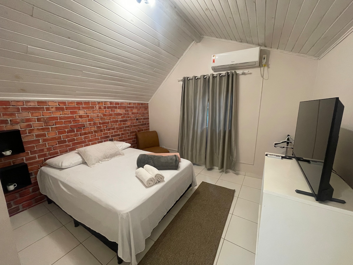 Moderna e nova estrutura exclusiva para locação temporária p/até 4 pessoas em rua silenciosa e central, a 80 mts avenida principal e supermercado. Possui ampla janela de pé direito com vista e ventilação. Equipado: cama queen castor, sofá-cama casal e outro solteiro, cortina black out motorizada, fogão indução, forno, cafeteira elétrica, torradeira, microondas, geladeira, liquidificador, ferro, TV42, ar condic., ventilador, secador cabelo, Wi-Fi, utensílios cozinha.