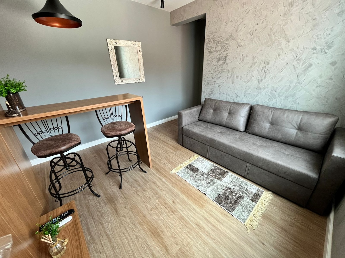 Stiúideo nua - aimseartha agus cluthar. Cistin iomlán atá feistithe le Minibar, Micro, AirFryer, CookTop, Déantóir Caife agus Déantóir Ceapaire, teilifís" 42 le Smart Roku, Wi - Fi, Aerchóiriú, Leaba Bosca Dúbailte le Bicama. In aice leis an Margadh, Cógaslann, Bácús, Ospidéal Vicent/São Camilo (100 mt), 13* bib (1.7 km) Campas UEPG (3.3 km), Ospidéal Réigiúnach (3.8 km), Centro (4.5 km) agus is pointe straitéiseach é dóibh siúd ar mian leo aithne a chur ar Beauties an Réigiún, mar shampla Vila Velha (23 km), Buraco do Padre (25 km) agus Alagados (19 km).
