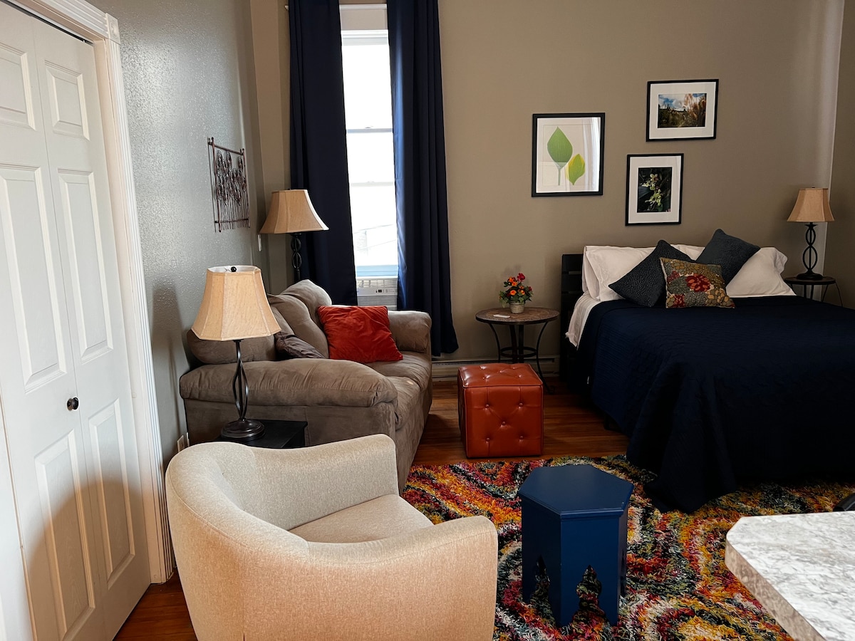 Fáilte chuig do theach as baile i gcroílár Brooklyn stairiúil, Iowa! Lonnaithe ar an dara hurlár d'fhoirgneamh i lár na cathrach, tá cistin iomlán, cúinne oifige, seomra folctha, agus áit chónaithe mhór ina bhfuil áiteanna codlata sa spás seo. Bain sult as radhairc áille i lár na cathrach, díreach céimeanna ó Ionad Pobail Michael J. Manatt agus ó Áras Ceoldrámaíochta Brooklyn. Lonnaithe go lárnach idir Des Moines agus Iowa City, le rochtain éasca ar I -80, is é seo an áit iontach chun draíocht agus stair Brooklyn a bhlaiseadh.