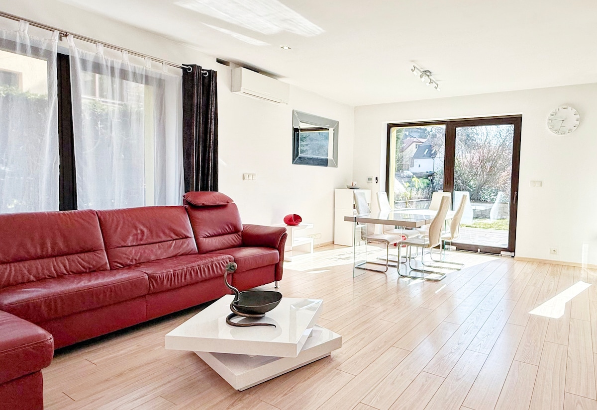 Tá ár villa suite in aice le Vyšehrad agus an tIonad Comhdhála, díreach céimeanna ó Chearnóg Wenceslas. Tá gairdín ann atá foirfe do bheárbaiciú, ardán fairsing a thairgeann radhairc iontacha, linn snámha théite, tobán te agus sabhna (tuilleadh eolais faoin táille folláine thíos). Timpeallaithe ag siopaí agus bialanna, le rochtain éasca ar thramanna a théann go dtí an Seanbhaile. Má tá tearmann síochánta compordach á lorg agat gar don Seanbhaile, is é seo an ceann scríbe is fearr duit.