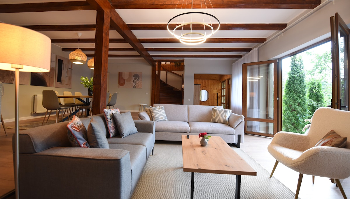 Villa sómasach i suíomh suaimhneach dúlra atá lán le fiadhúlra amhail fianna. Tá 7 seomra leapa agus 6 sheomra folctha iomlána, cistin iomlán, bálseomra le both Dj le tábla measctha, sna tithe tábhairne, 6000 vata, CCTV, ríomhaire glúine réamh - mheasta físe, Billiard - linn, leadóg bhoird, spá le 2 sauna agus 3 jacuzzis freisin. Tá radharc draíochtúil ag an teach seo i dtreo na sléibhte, atá in aice le dul ag sciáil nó ag clársciáil. Áit fhoirfe chun imeacht ón gcathair agus do scíth a ligean.Tá cóisirí batchelor cairdiúil.
